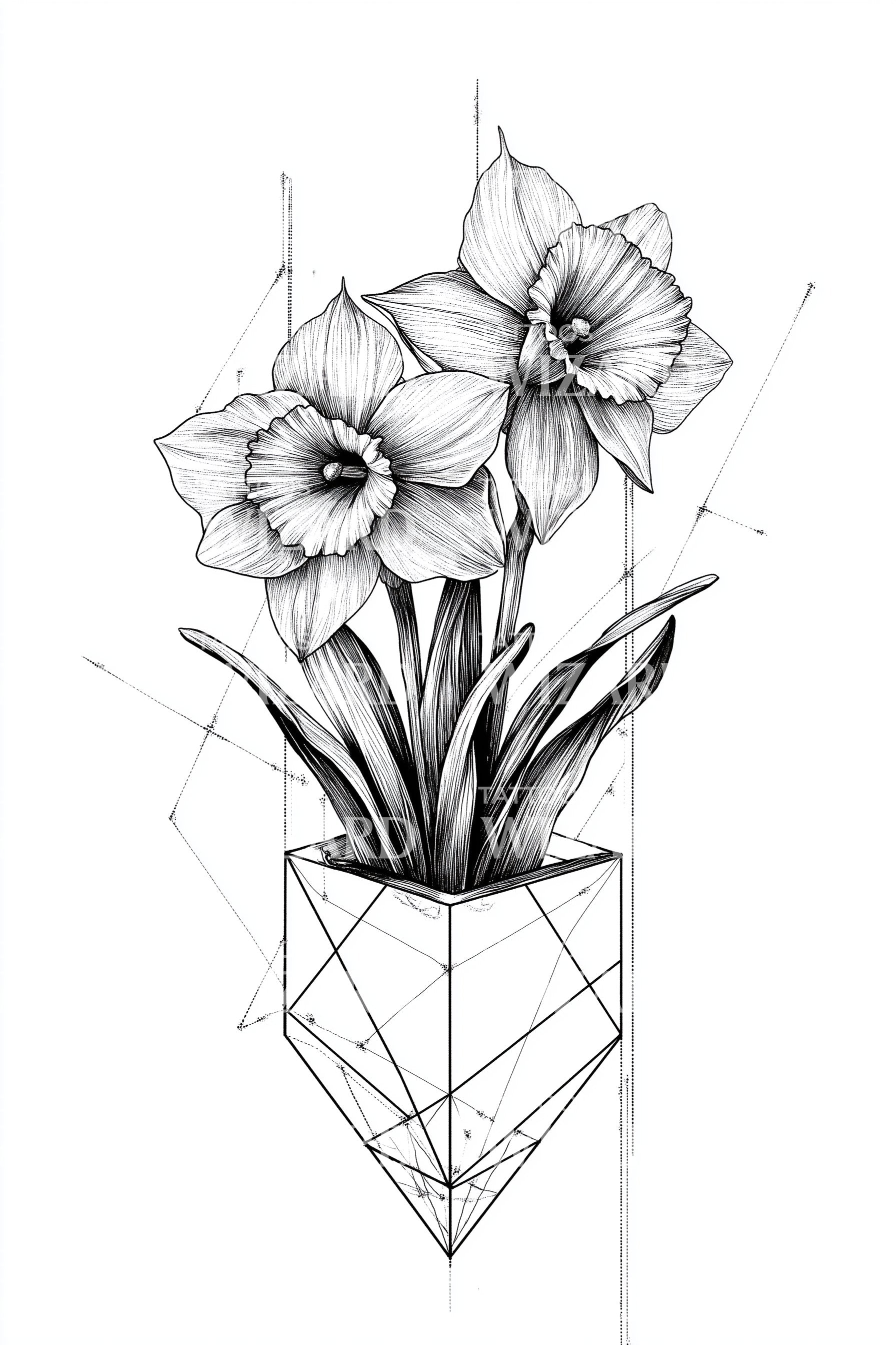 这个抽象纹身设计结合了素描水晶和水仙花植物,巧妙地与几何元素交织在一起。这是自然脆弱性(由植物代表)与水晶持久力量的非传统融合。这件独特的素描作品将吸引那些欣赏抽象象征艺术的人。
