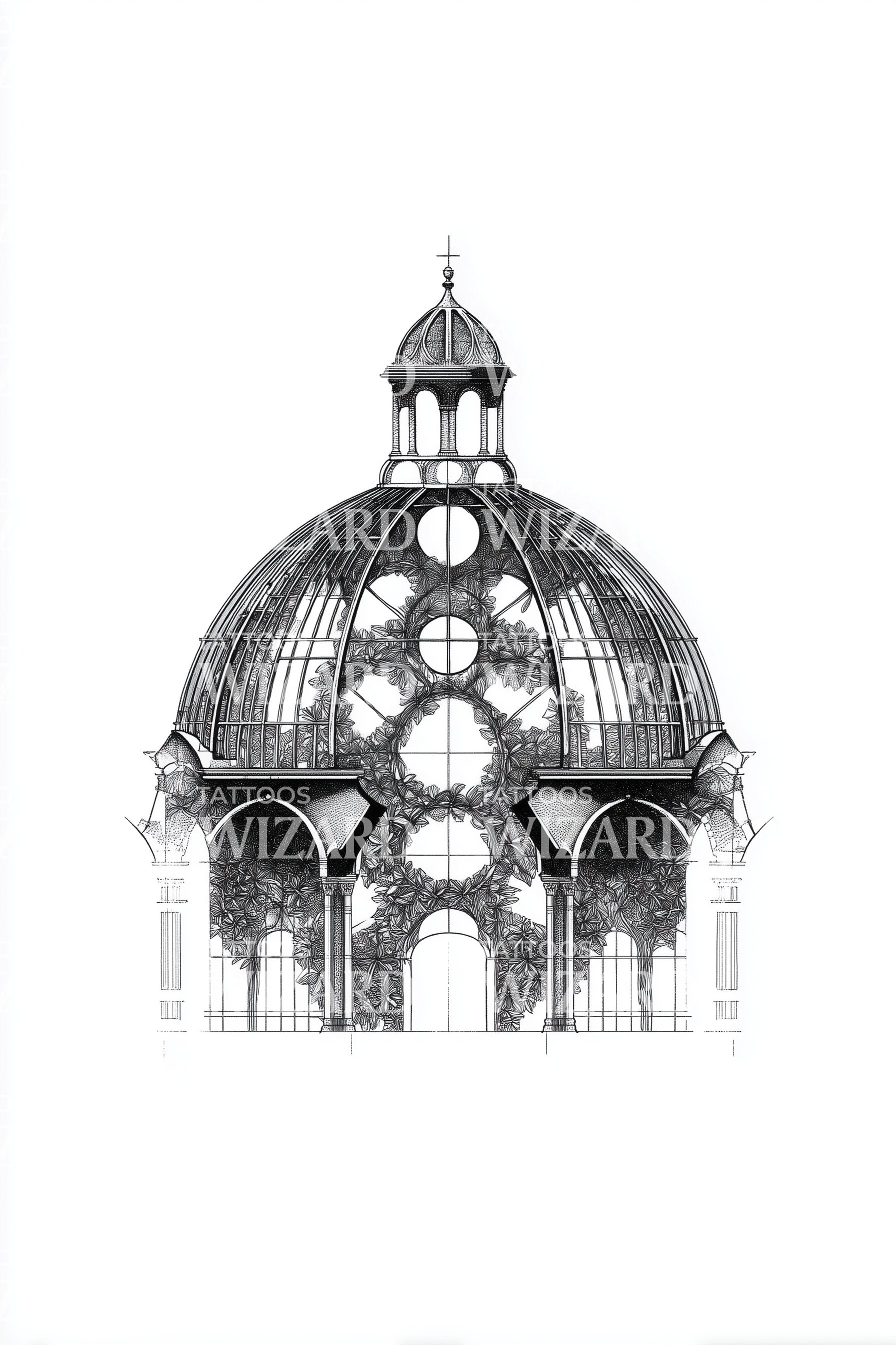在您的肌肤上体验复古建筑风格,这款经典的黑灰纹身设计。设计中精心描绘的圆顶细节,巧妙地呼应了传统遗产与圆顶结构。这件作品是对经典建筑的永恒致敬,必将令历史设计美学爱好者满意。