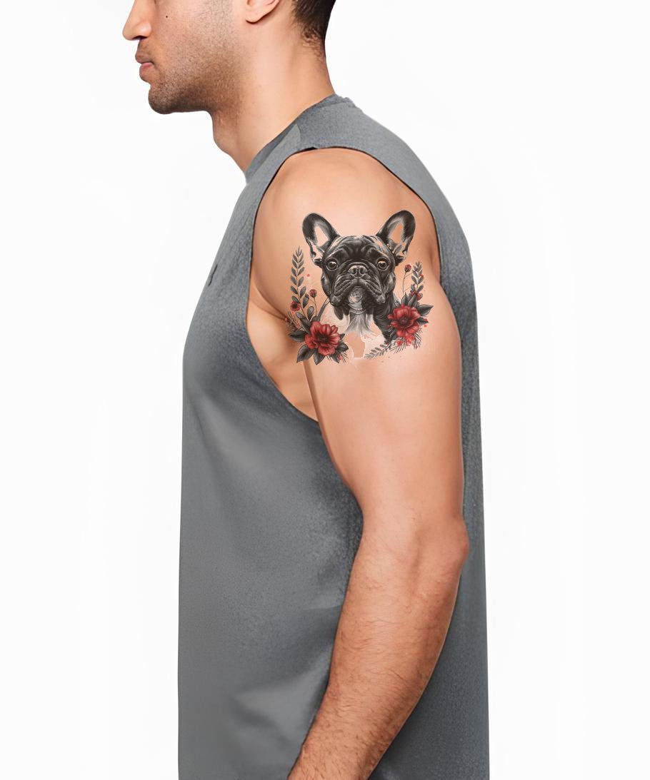 体验您对宠物的大胆表达,这款惊艳的法国斗牛犬纹身设计充满了插图玫瑰,完美捕捉了人类忠实的朋友。小狗的可爱与花朵的新鲜感相结合,呈现出对您心爱的法国斗牛犬的独特致敬。