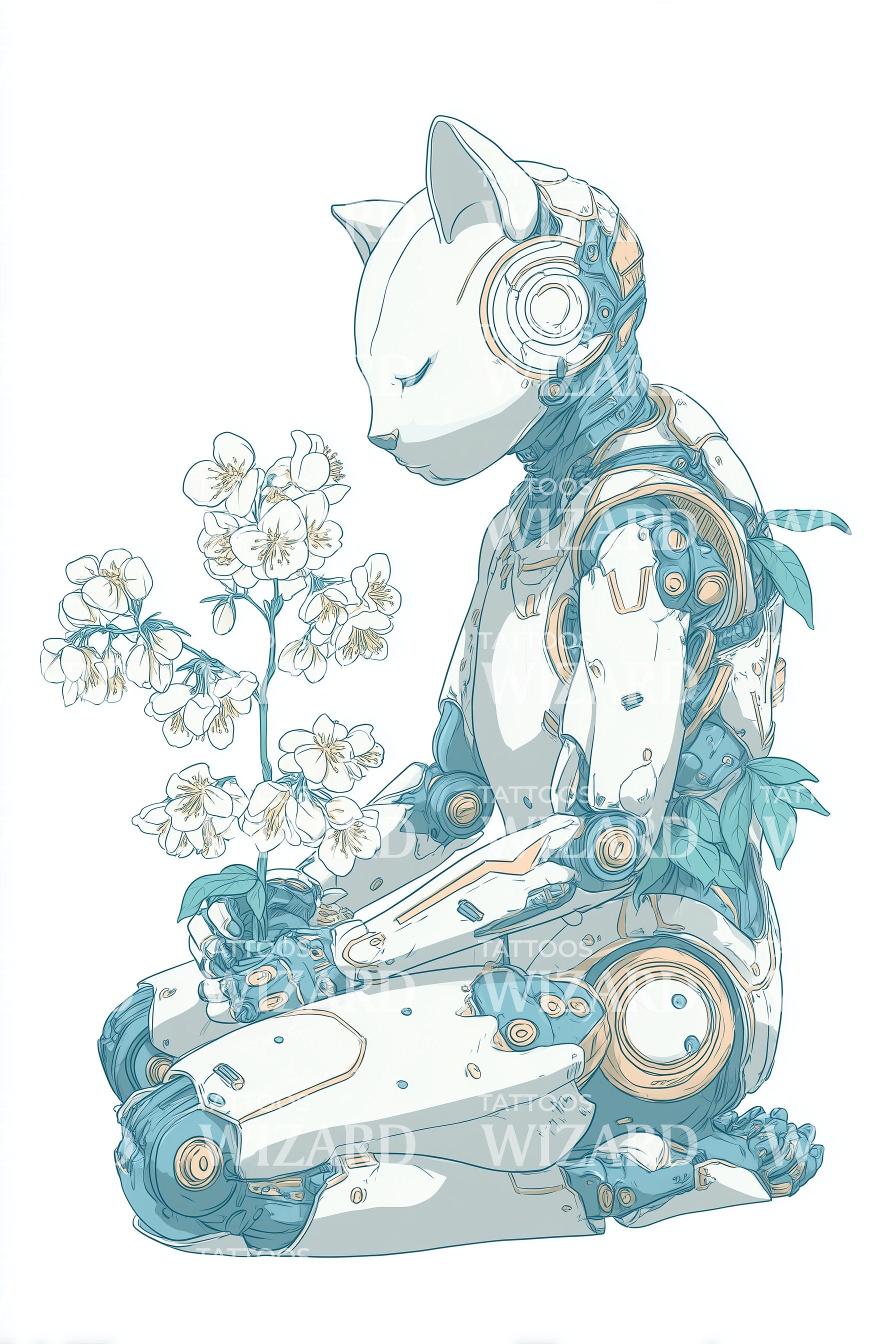 拥抱这款水彩纹身设计所展现的奇幻艺术世界,将你对猫咪的热爱与迷人的机器人宇宙完美融合。这个创意大胆引发对冥想的深刻思考,点缀以精致的花卉图案和富有魅力的赛博元素。它古怪、神秘且富有冥想意味。