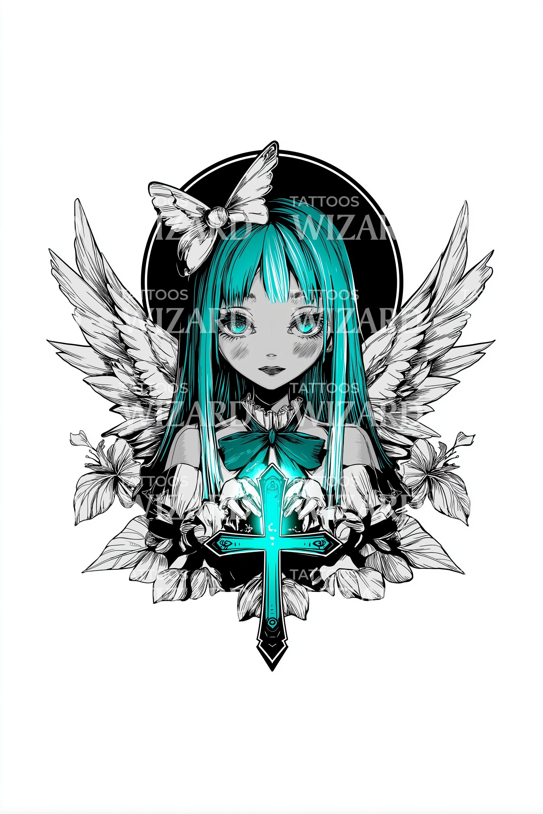 沉浸于我们赛博天使纹身设计的未来优雅之中。感受信仰如何赋予插画细节生命——神圣的天使与十字架符号交织融合。这是科技与灵性相遇的见证。非常适合热爱独特赛博风纹身故事的你。