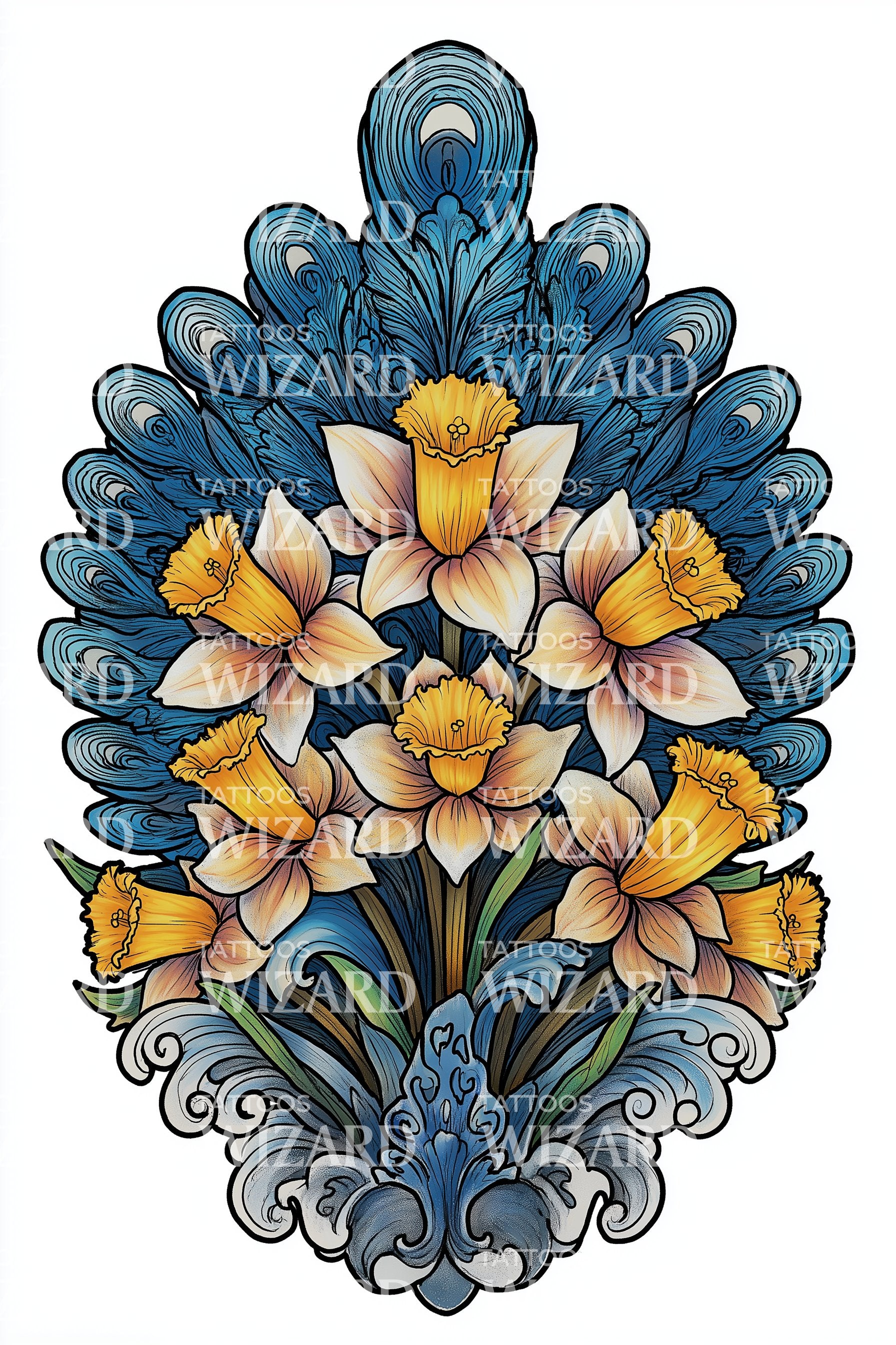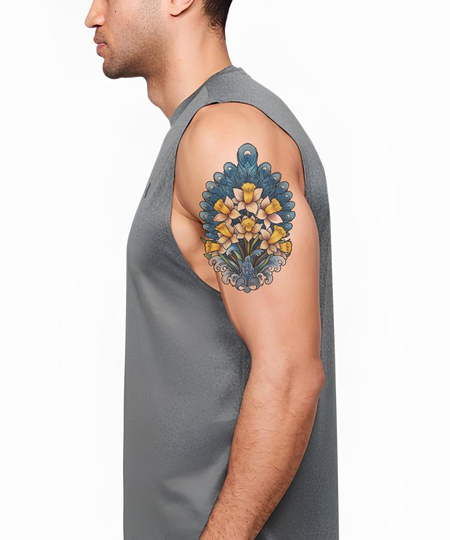 沉浸于这款新传统纹身设计的宏伟之中。其构图在纹章中展现了复杂的纹章象征,艺术地融合了装饰性的蔚蓝水仙花簇。这不仅仅是一款纹身,更是印刻在你肌肤上的皇家宣言。
