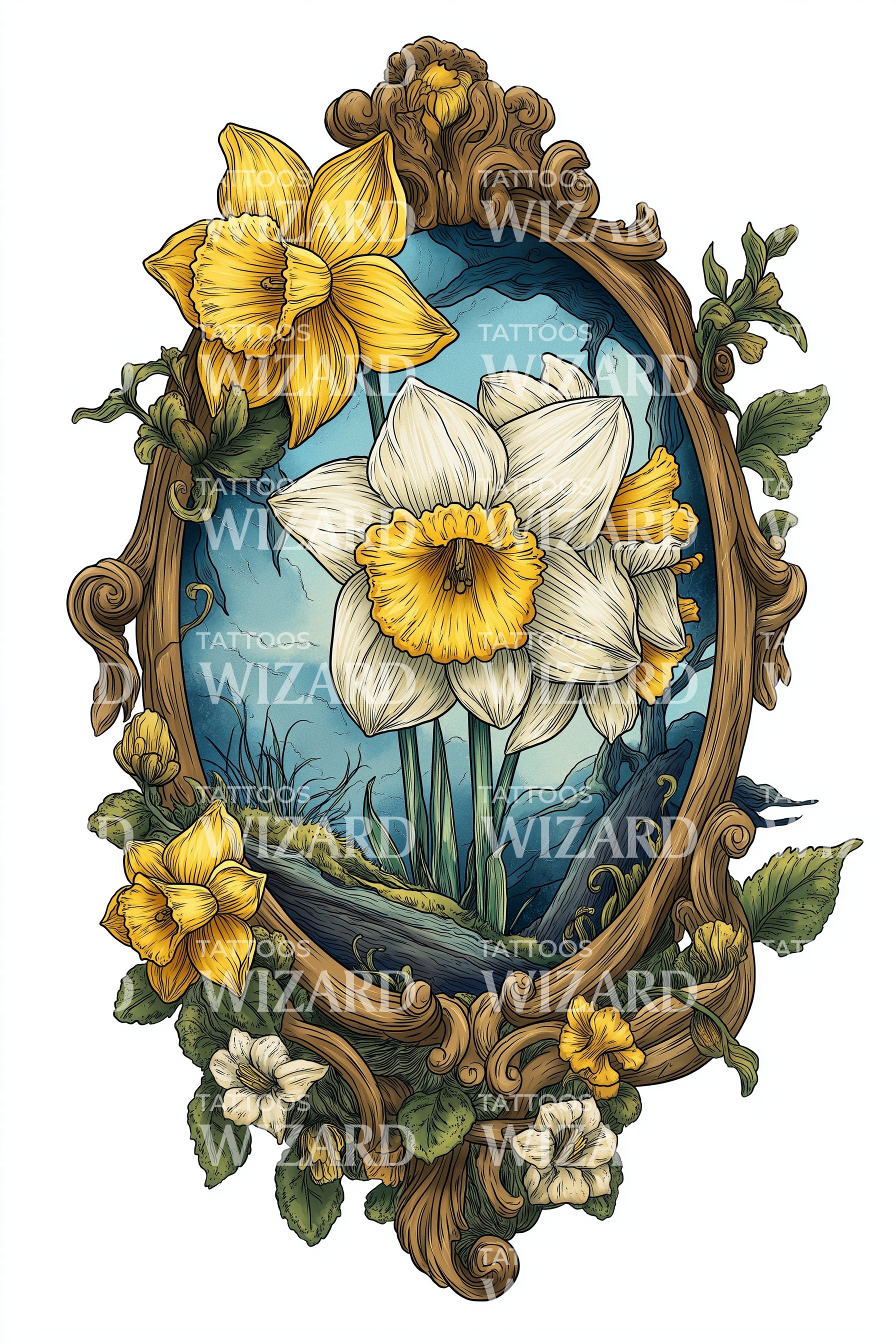 这款插画风纹身设计以镶嵌着精美水仙花的金色花环为特色。花朵优雅地环绕圆形边框,传达出细腻而强烈的魅力。沉浸于金色光辉的迷人魅力和这款独特设计中完美捕捉的苏醒春日精神。