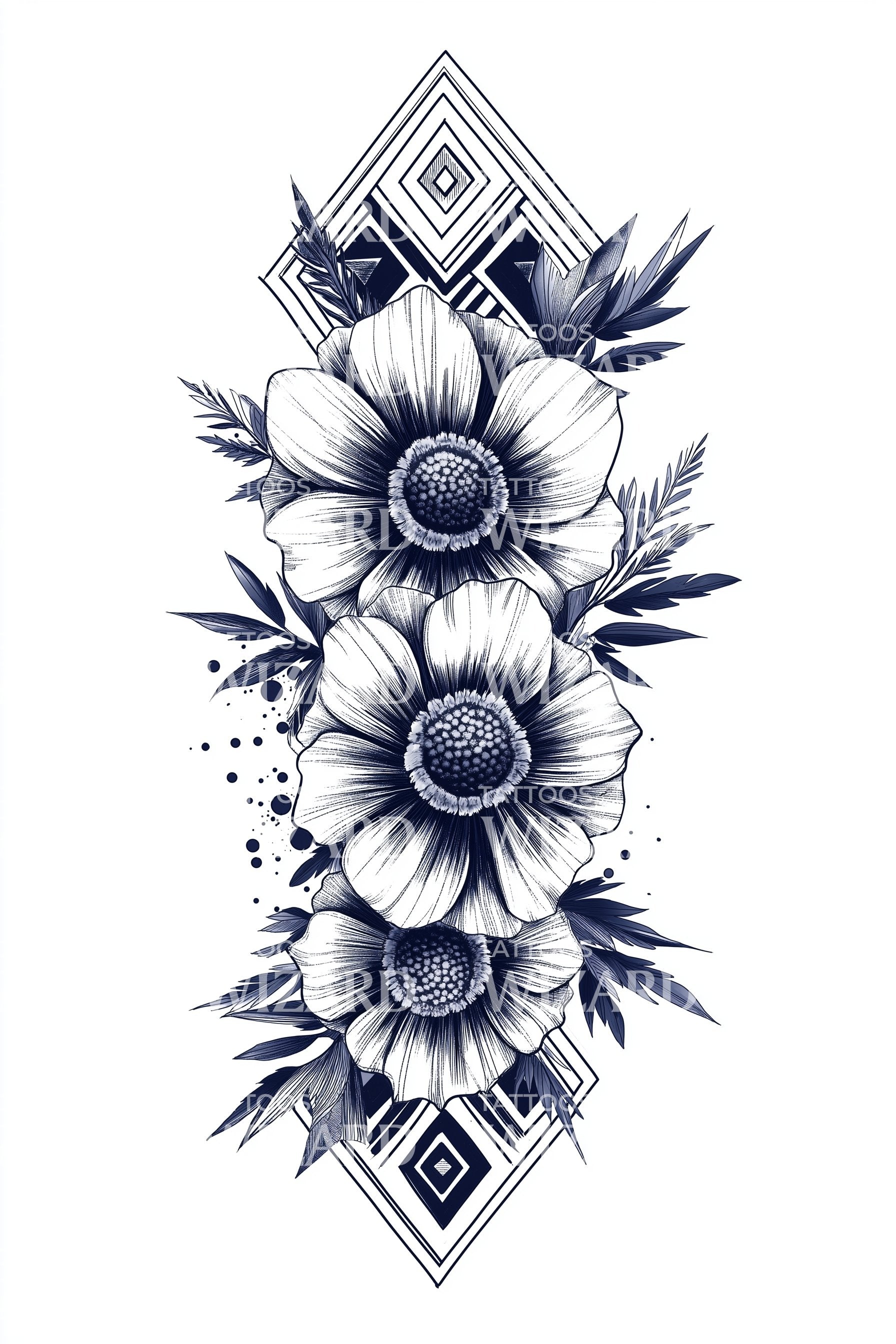 沉浸于这款插画纹身设计所展现的华丽图形优雅世界。画面展示了一组迷人的雏菊花朵,采用惊艳的靛蓝色调绘制。这幅花卉杰作融合了精致与艺术气息,是表达您独特风格的完美选择。