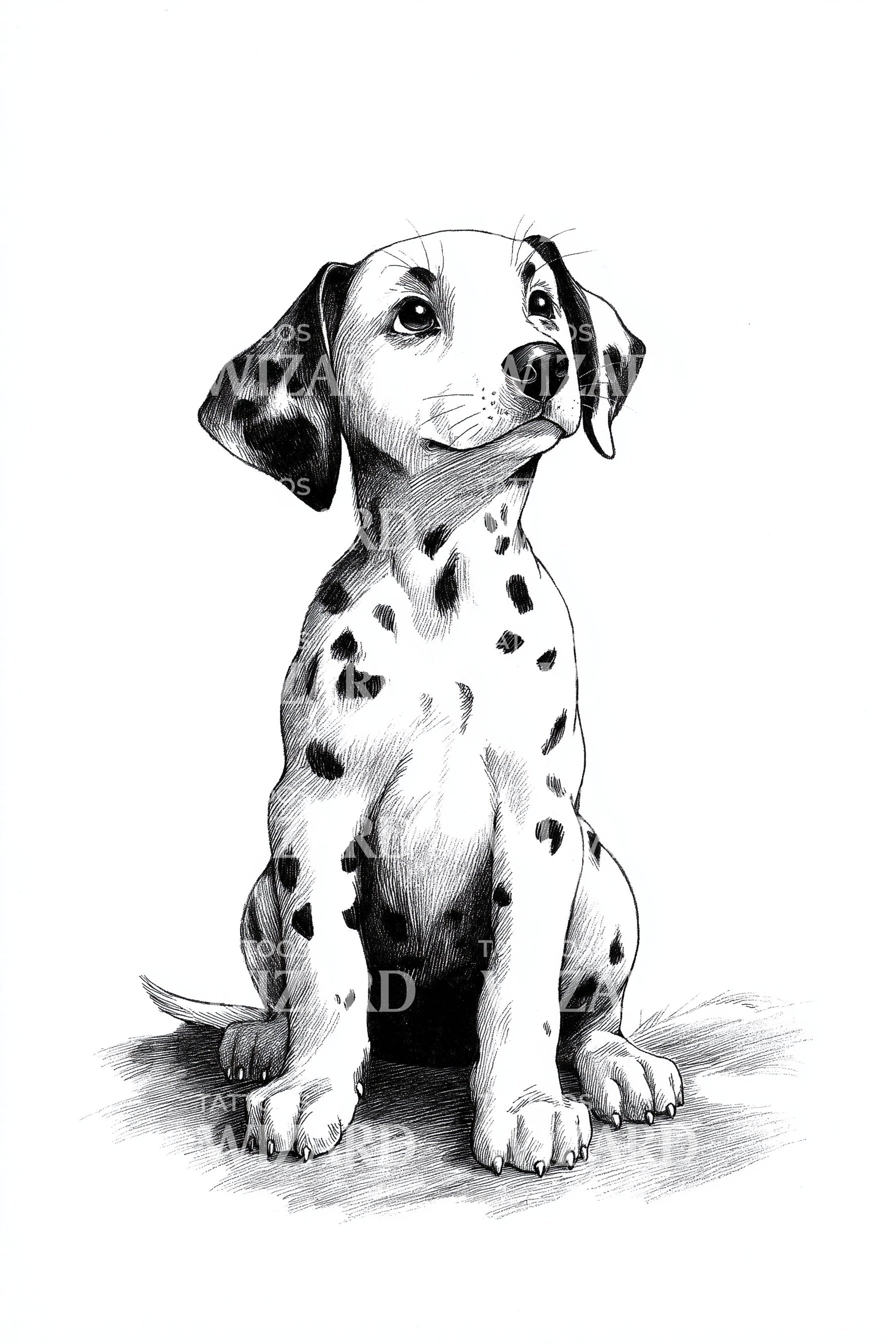 Fine-line realism renders a mini Dalmatian puppy sitting patiently, spots crisp, eyes glossy with wonder, fur softly shaded. Symbol of loyalty and fresh starts, it celebrates playful curiosity and steadfast heart. Wearing it invites daily warmth, optimism, and an adorable guardian of simple joys by your side.