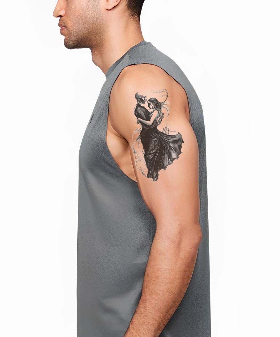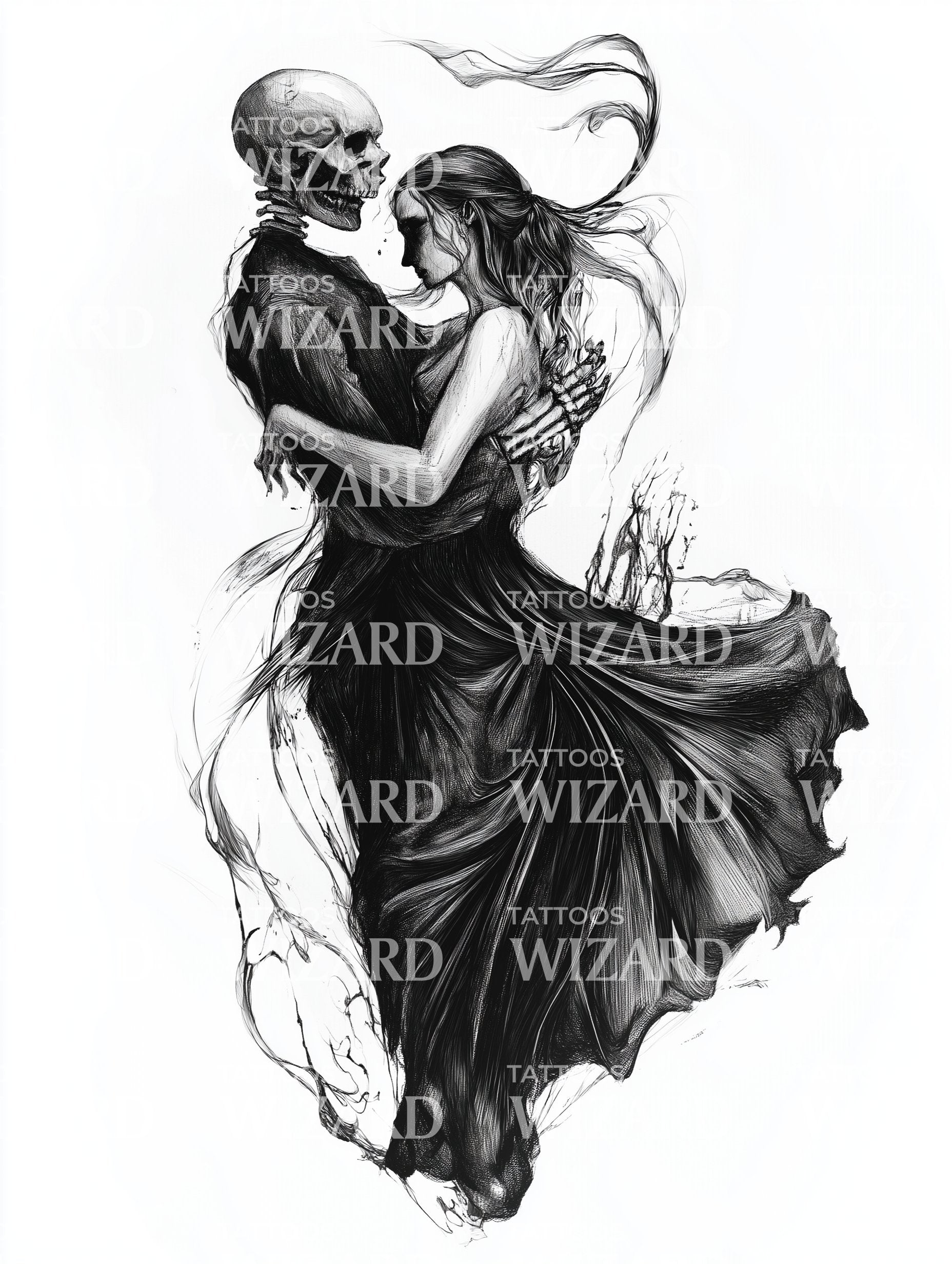 用我们的浪漫骷髅纹身设计揭示你大胆的个性。采用黑色和灰色,这种死亡与爱的独特融合展现了一位跳舞的骷髅,象征着死亡的永恒舞蹈,但却带有持久浪漫和激情的底蕴。被它超越生命的独特爱情表达所吸引。