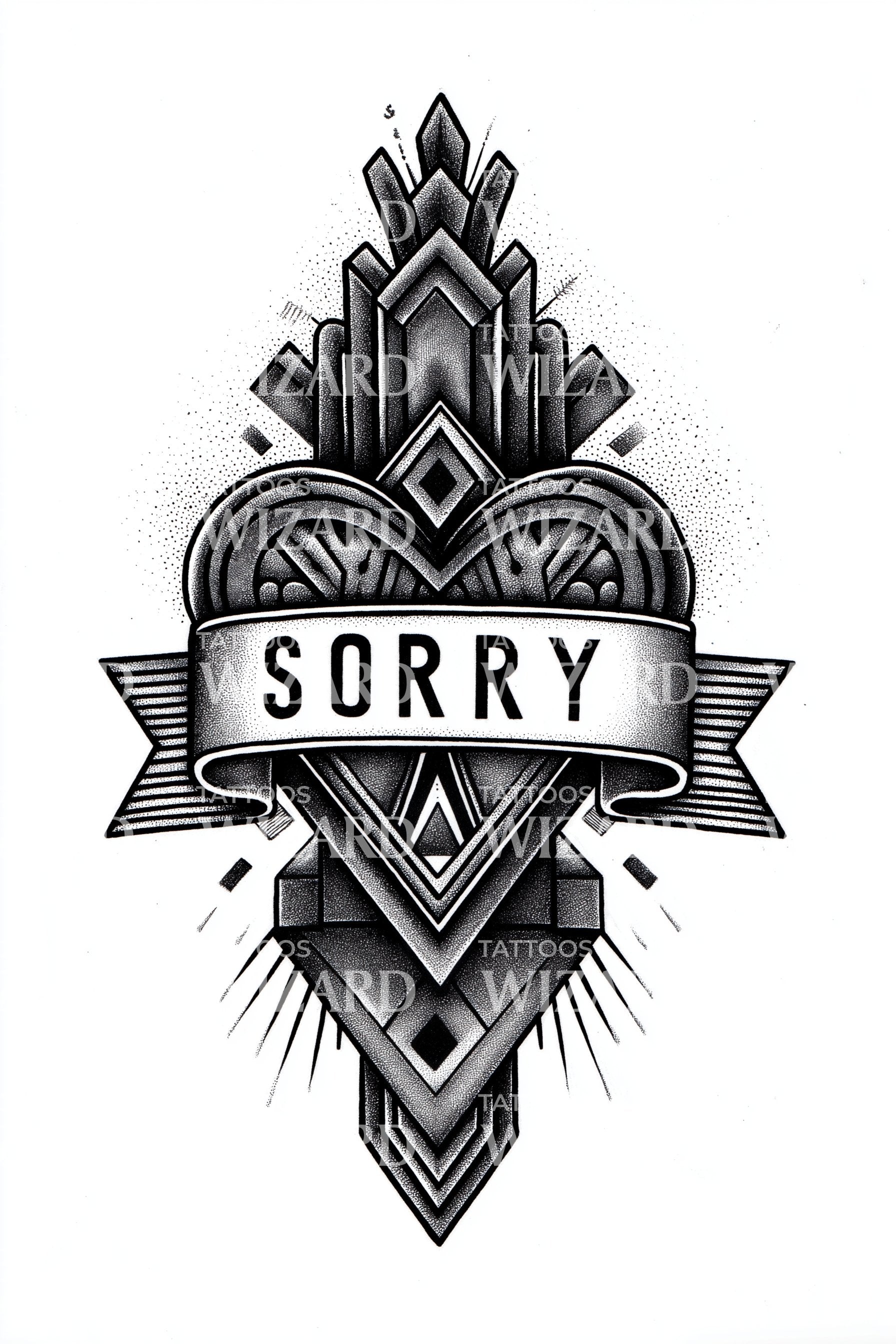 这款精美的装饰性纹身设计,以装饰艺术风格为特色,在其复杂的图案中展现了真挚的“抱歉”。它体现了优雅与情感的道歉,这件独特的作品不仅传达了情感,还为您的纹身收藏增添了复古魅力。