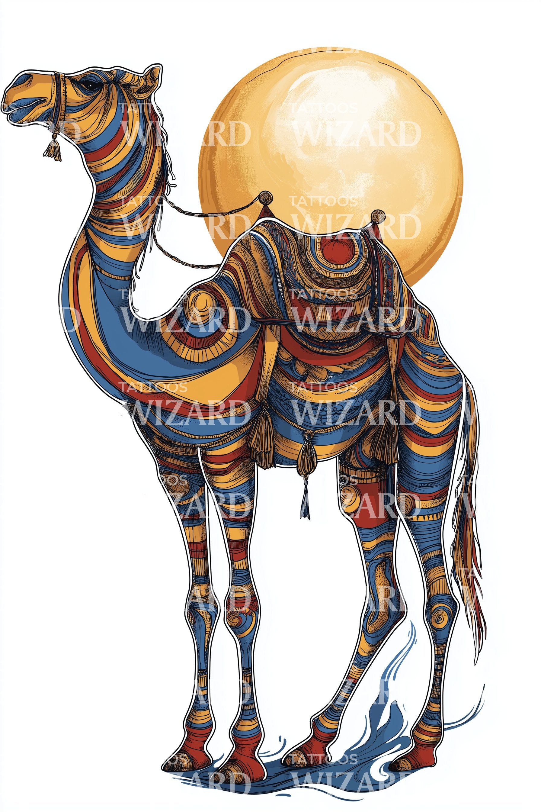 一款梦幻的水彩纹身,描绘了骆驼剪影穿越银色月光下被风吹拂的沙漠。流动的色彩融合了沙金、暮紫和靛蓝,唤起旅行、游牧精神和探险地平线的意象。柔和的边缘和细腻的飞溅营造出动感,讲述着对远方的渴望、坚韧不拔和星光之旅的故事。穿越无尽的沙丘。