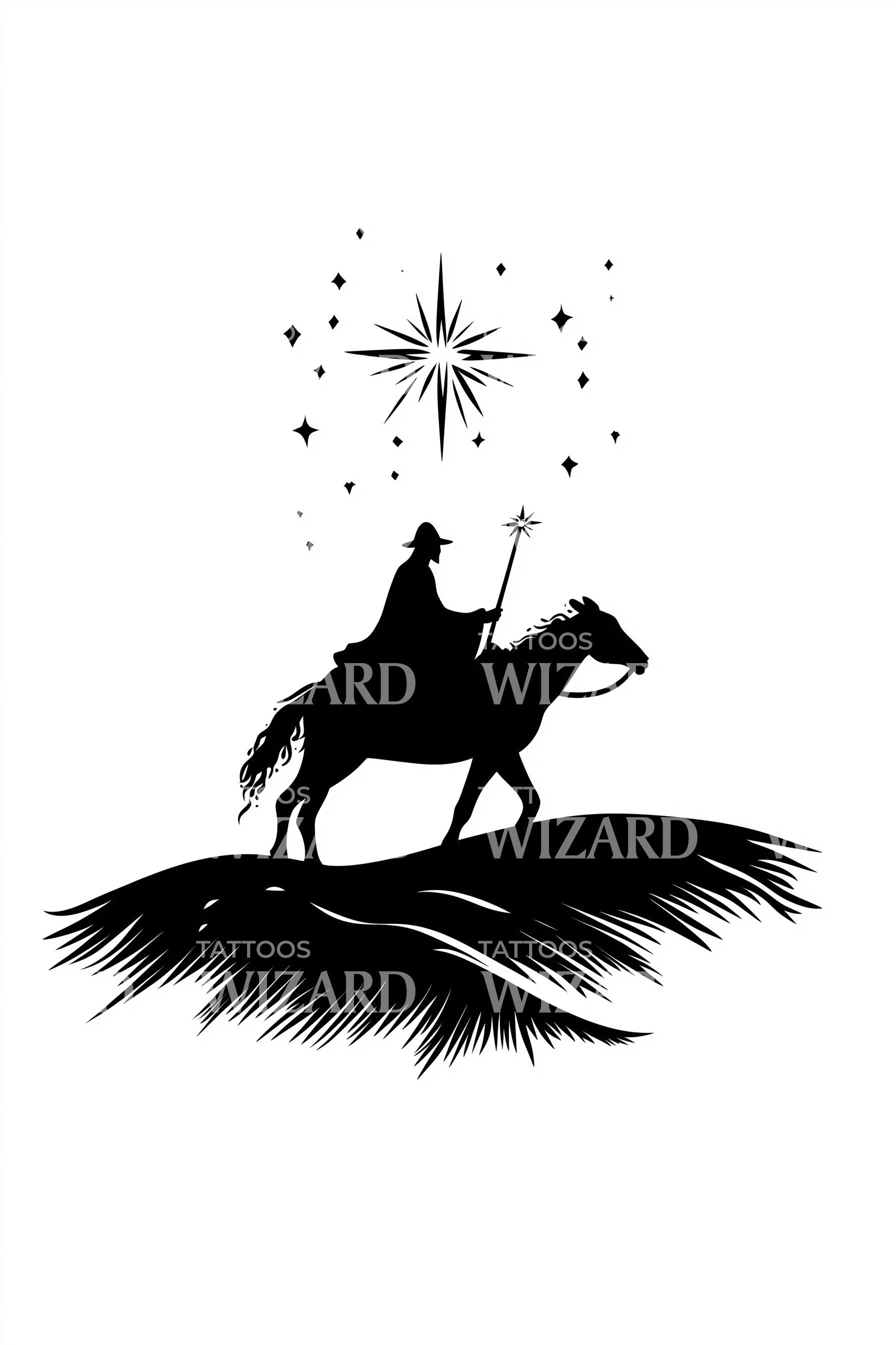 沉浸于游牧生活的魅力,这款细线纹身设计展现了一只勤劳的骆驼,置身星空下的沙漠商队中,凝聚了旅途的激动与旅行的喜悦。一个引人入胜的设计,讲述着沙漠旅者的神秘故事。