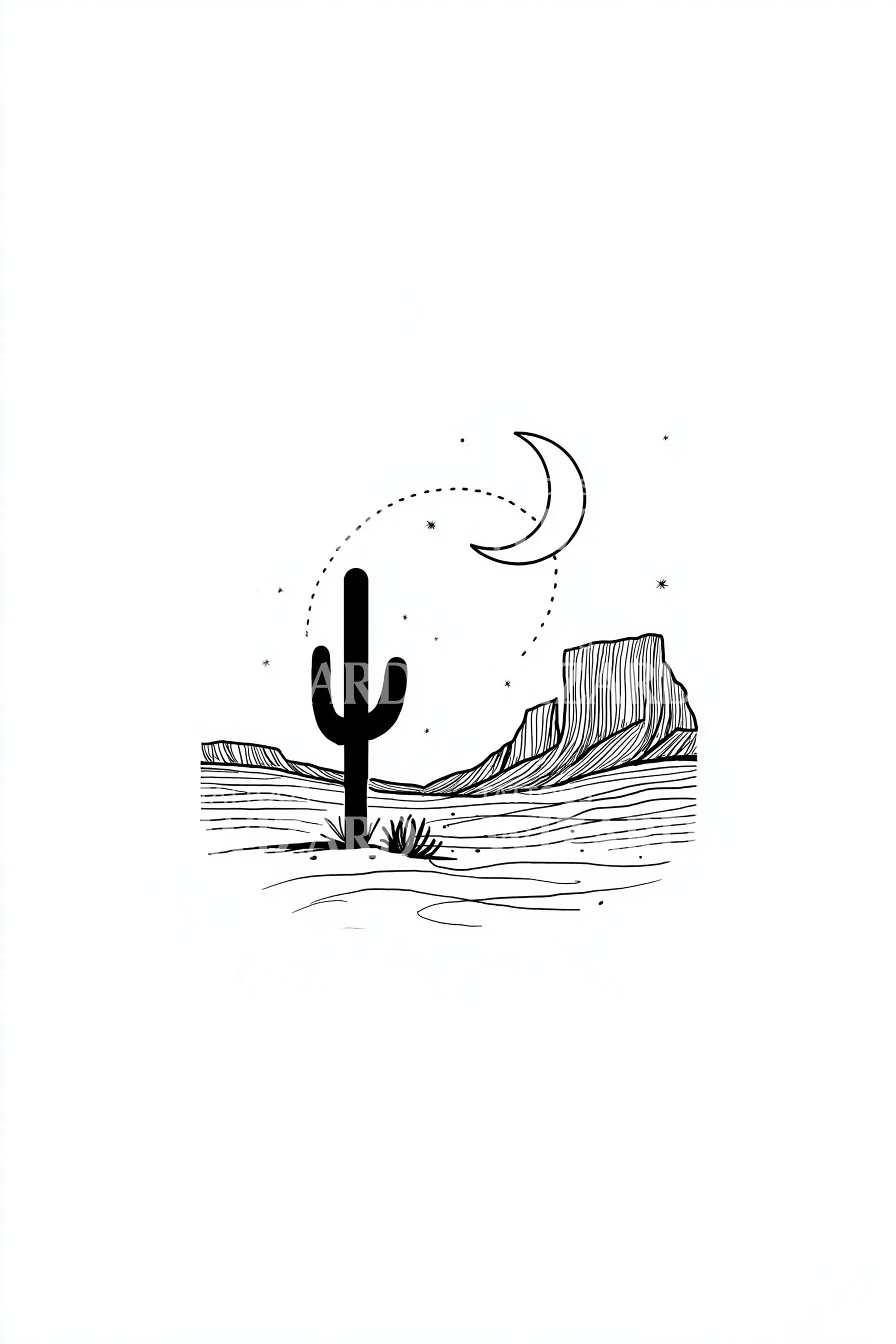 Minimal desert postcard etched in crisp lines: a saguaro stands tall before layered mesas, stars and a crescent moon arcing above. Cactus speaks of resilience, moon of cycles and guidance, open sands of possibility. Wear it for quiet courage, wander-ready hope, and horizon-loving calm, under a listening sky.