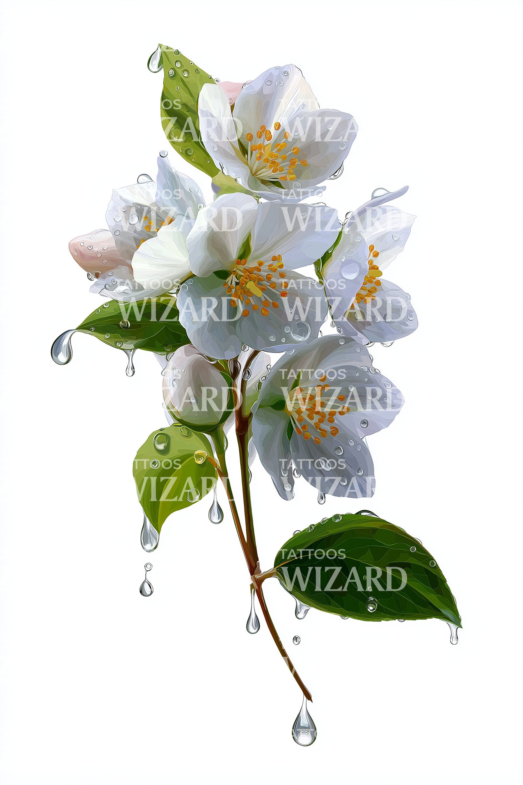 沉醉于这款精美的茉莉花纹身设计,展现出令人惊叹的微写实艺术。它充满了清新的花卉之美,描绘了一簇带露珠的娇嫩茉莉花。逼真的细节唤起宁静安详的感觉,使这件作品成为对大自然壮丽景象的永恒颂歌。