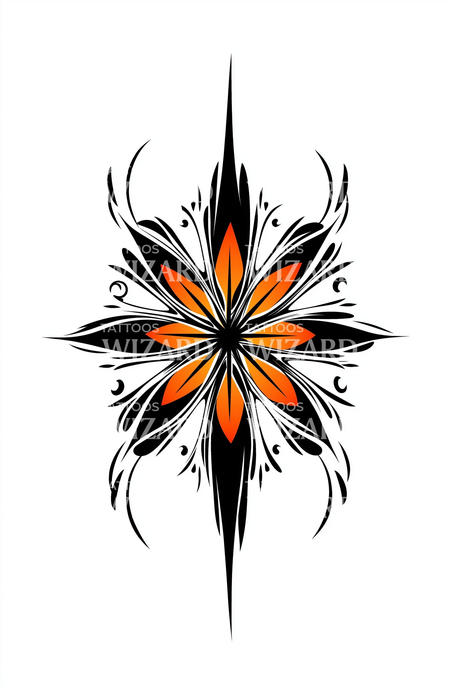 释放你狂野的一面,这款炽热的部落纹身设计巧妙融合了传统部落元素与现代美学,设计中心是一颗鲜艳的橙色钻石,周围环绕着飘渺的花朵和闪耀的星星,打造出独特迷人且引人注目的艺术作品。