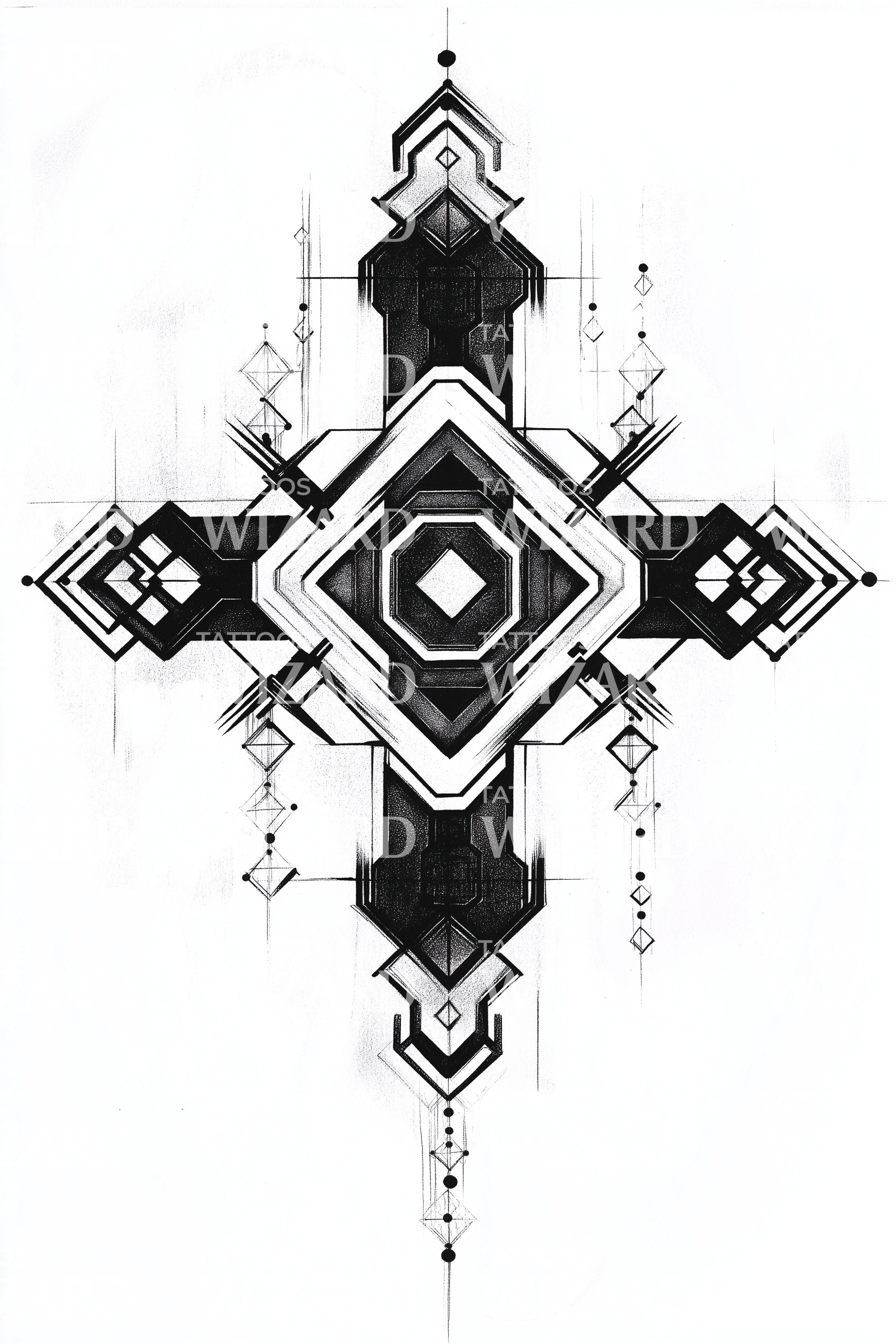 沉浸于这款华丽十字架纹身设计的精神魅力。它象征着神圣的抽象艺术,中央镶嵌着一颗耀眼的钻石,优雅地展现对称之美。作为神圣意义的象征,这一设计以装饰性的风格震撼人心,彰显出复杂与和谐中的大胆宣言。