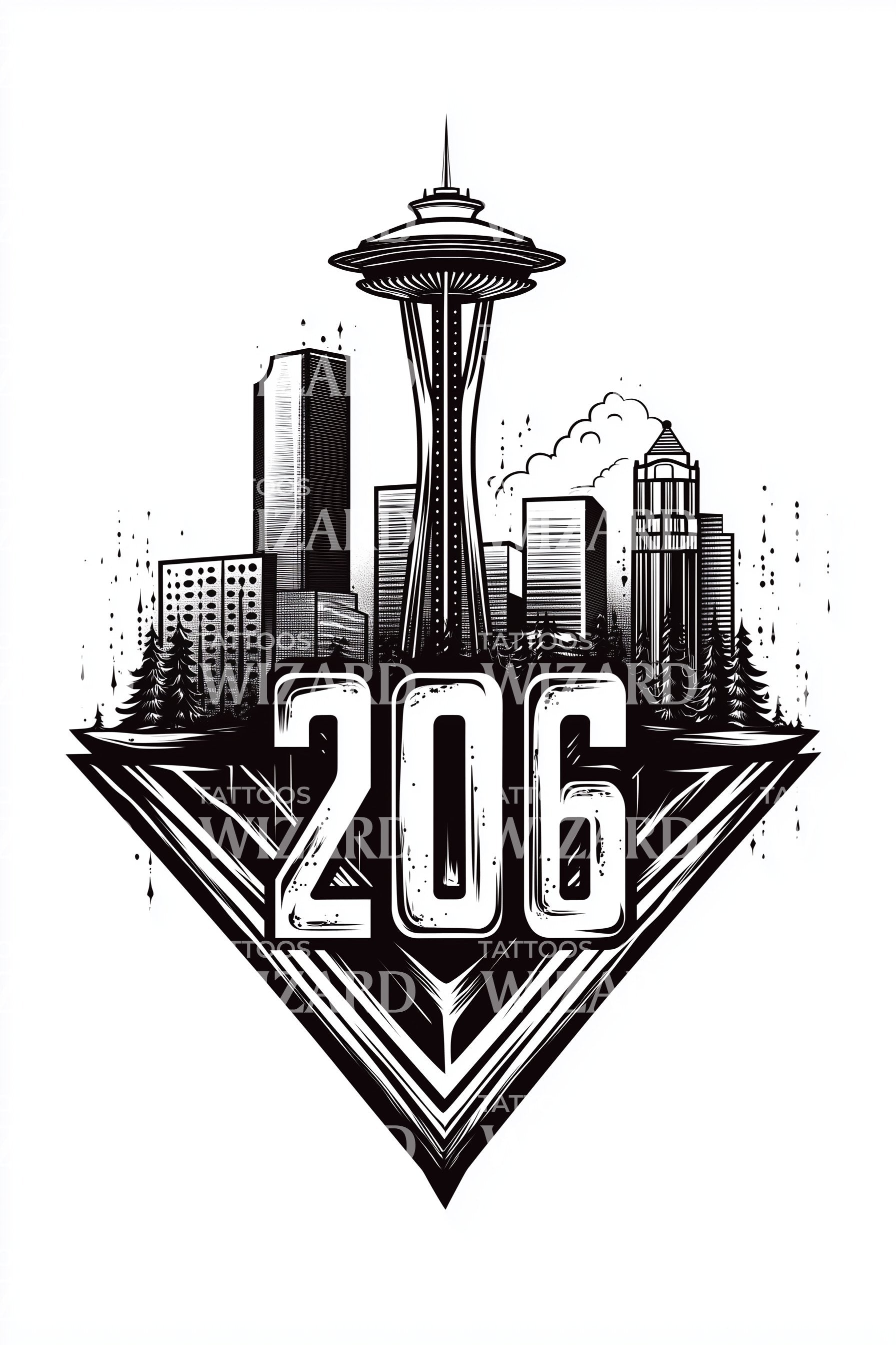 Bold blackwork emblem frames Seattle’s skyline, the Space Needle rising above evergreens, anchored within a faceted diamond. The carved 206 marks home and grit, like a street-numbered heartbeat. Symbol of clarity, the diamond sharpens vision; the needle points north. Wearing it feels rooted, resilient, and beautifully awake.