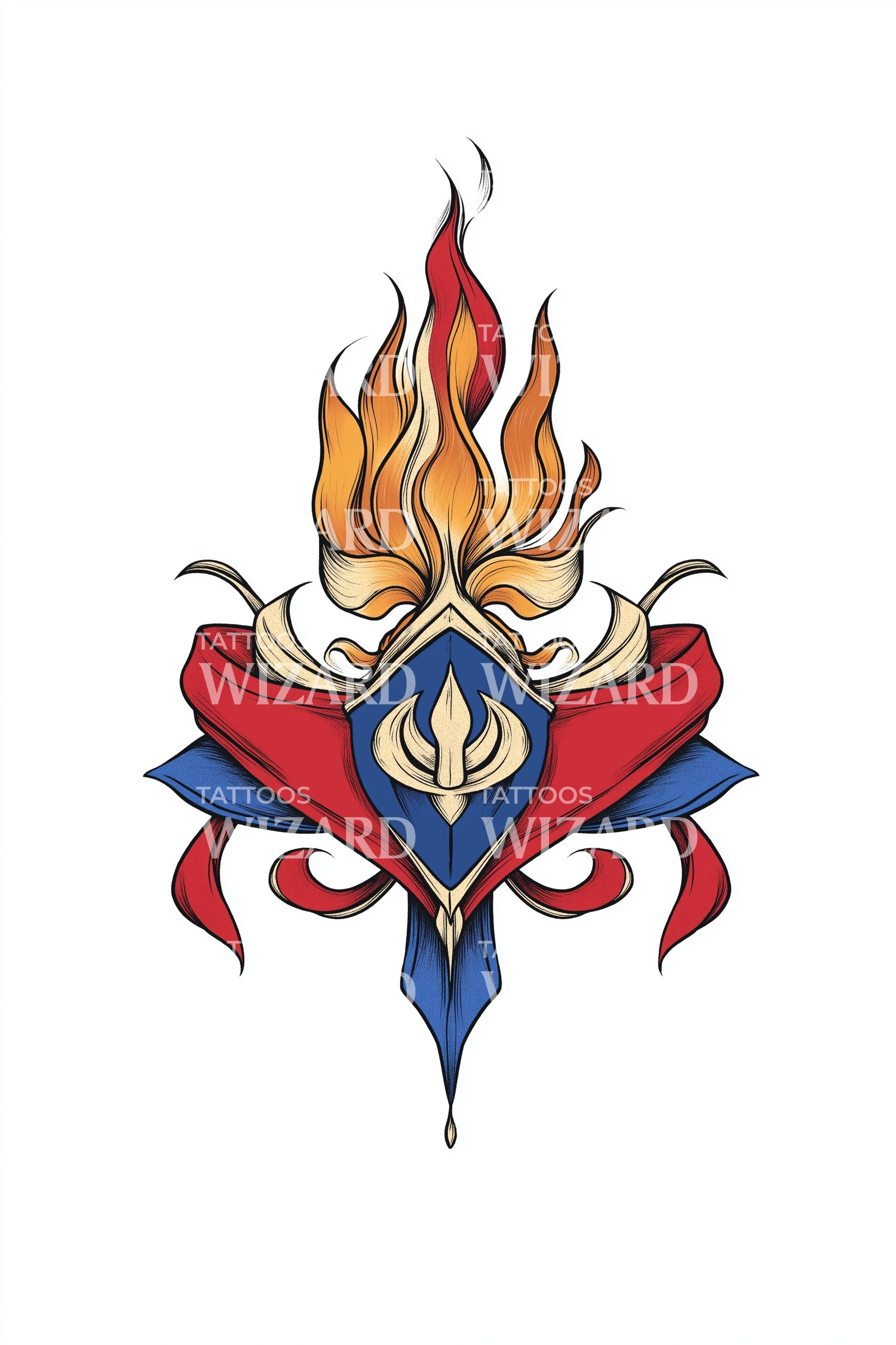 用这款抽象纹身设计点燃你的激情,体现红色火焰与蓝色徽章的动态融合。中心是一颗闪耀的钻石,增添了不可征服的气息。这是一件插画杰作,将大胆的火焰图案与冷静宁静的元素完美结合,呈现出独一无二的风格。