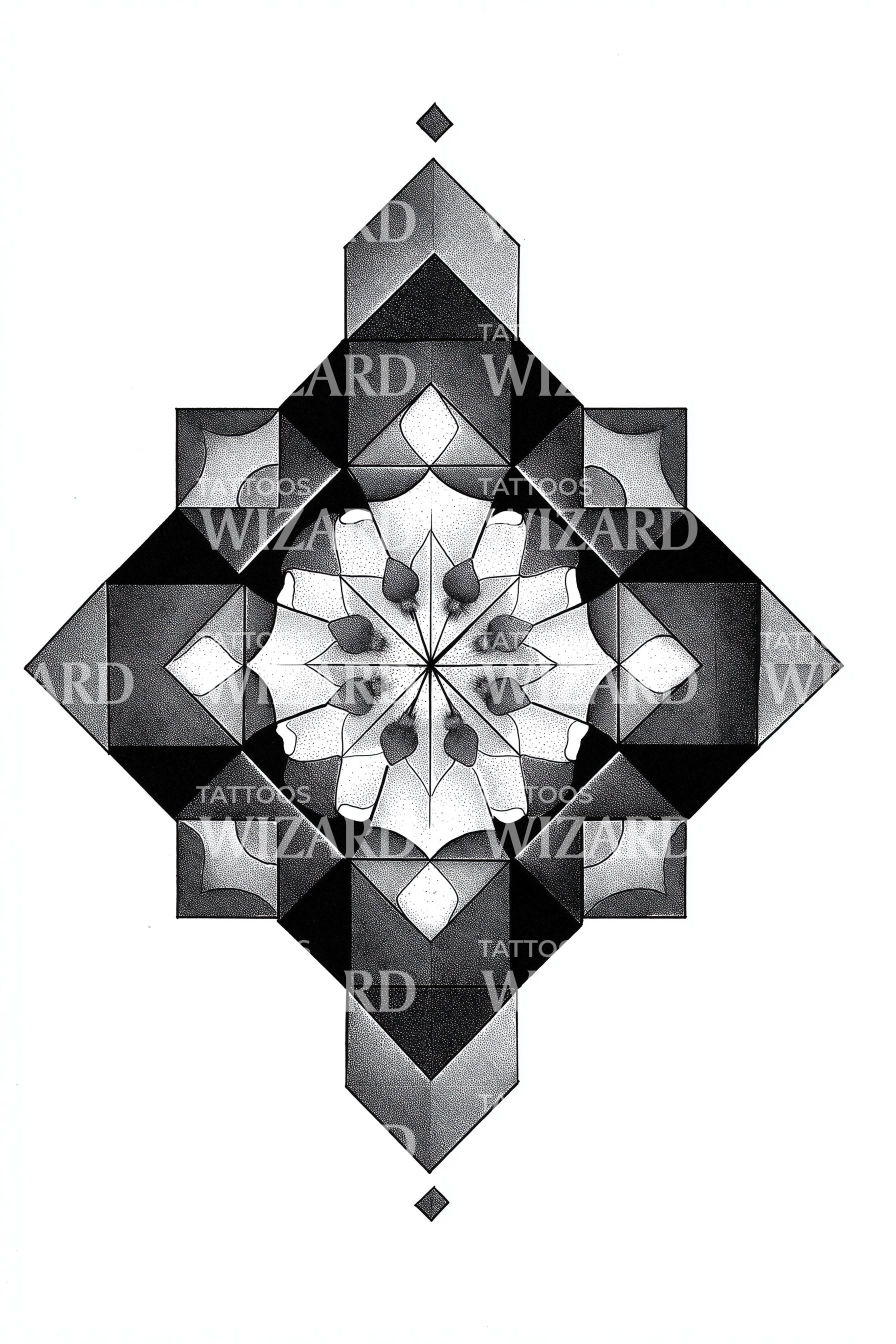 这款令人惊叹的黑色纹身设计巧妙地融合了几何与抽象主题,展现出一幅马赛克画面。设计如同镶嵌钻石的奇观,绽放出一朵通过迷人形状浮现的精致花朵。是追求大胆且精致艺术风格的纹身爱好者的完美之选。