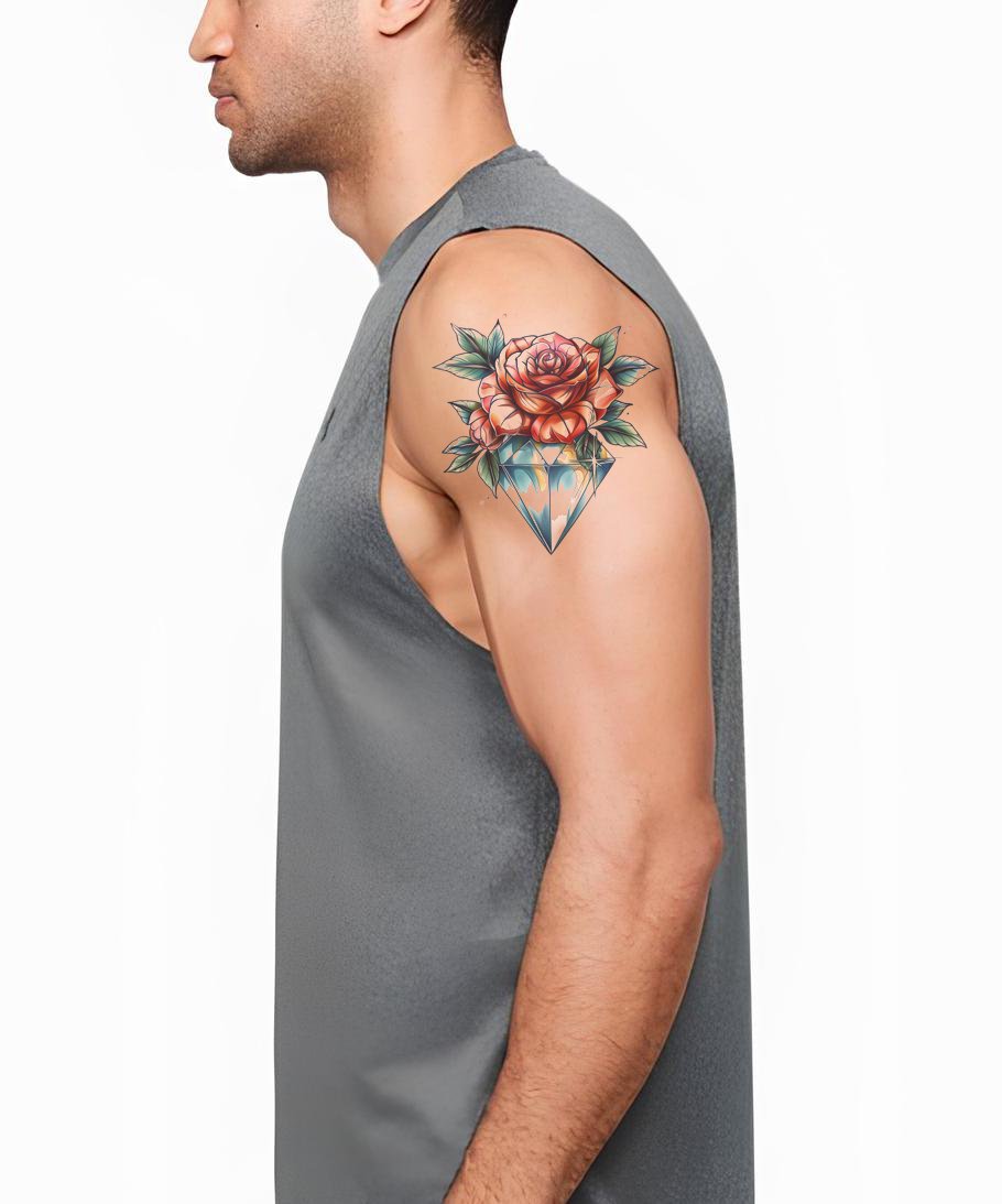 用这个钻石、玫瑰和水晶纹身设计来满足你对复古风格的热爱。它巧妙地捕捉了复古魅力和大胆创意,为一种古老的艺术形式注入了生命。这个设计将传统与潮流相结合,完美适合那些寻求独特表达的前卫个体。