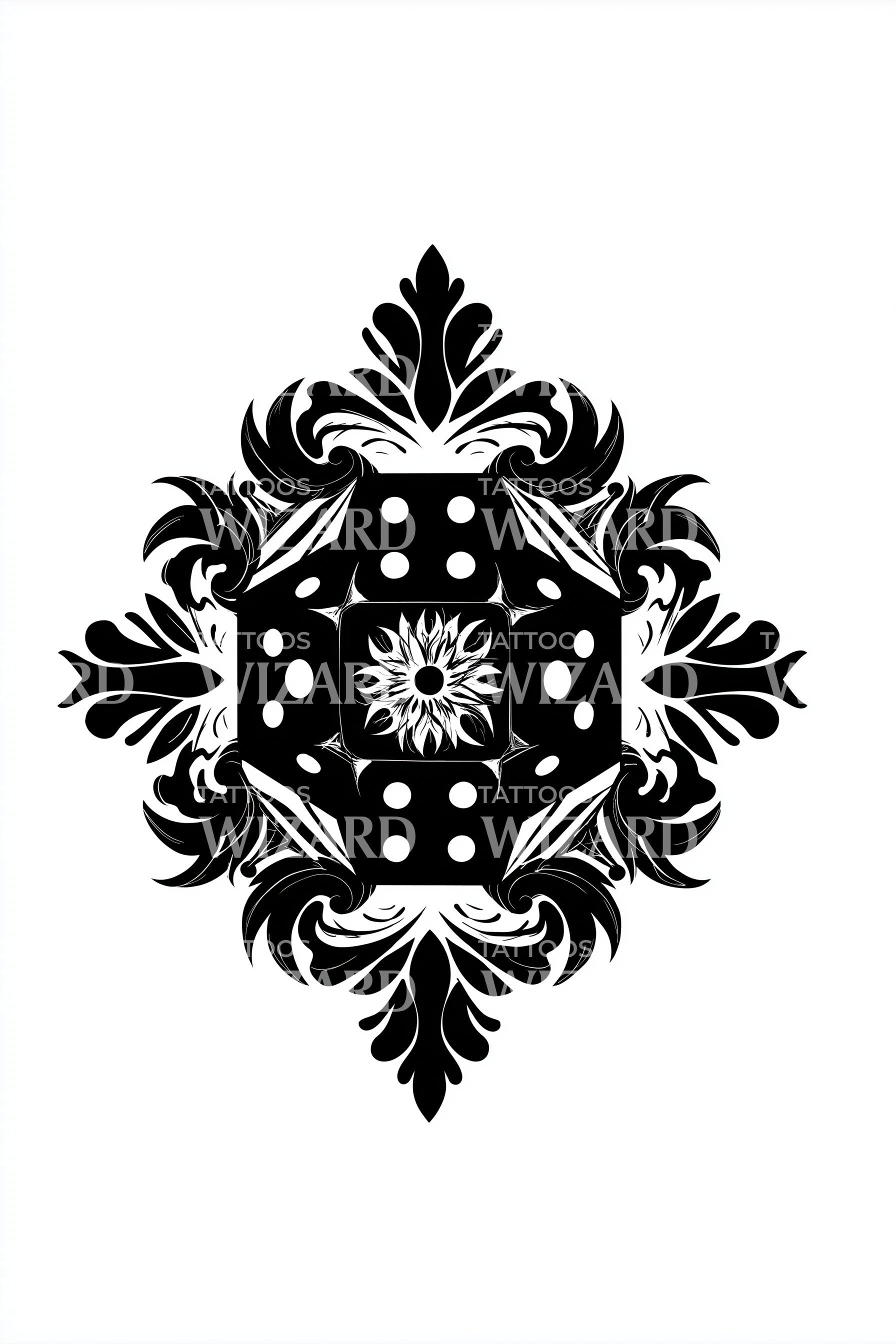 这款纹身设计巧妙地融合了几何与艺术,采用曼陀罗灵感的装饰图案。它以引人注目的骰子图像象征幸运与机遇。非常适合喜爱独特、象征性且视觉冲击力强的纹身的人士,这一设计既是时尚的配饰,也是个人的幸运符。