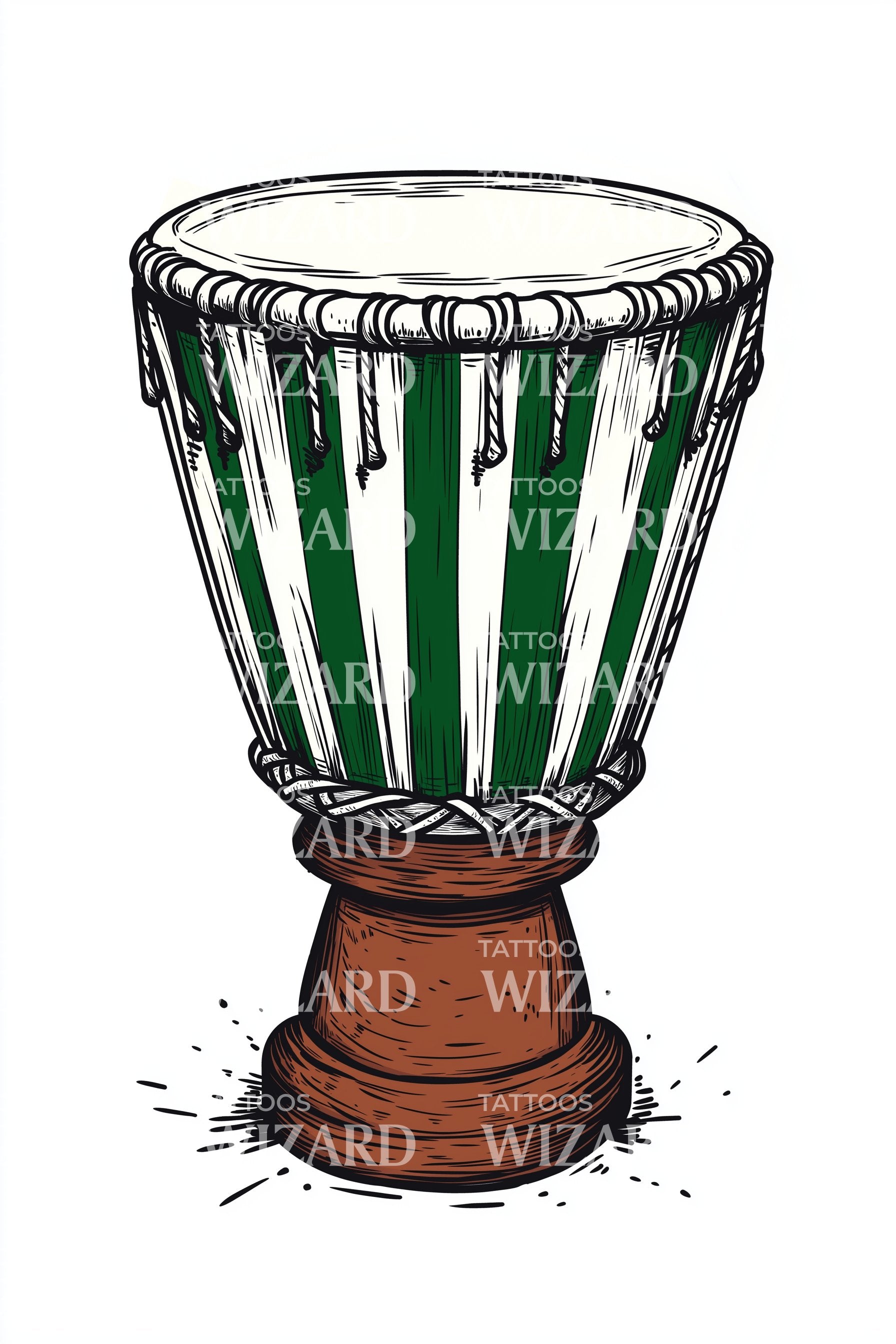 释放你对尼日利亚的热爱,这款插画风格鲜明的纹身设计。纹身以精致绘制的金贝鼓为特色,散发出丰富的非洲文化遗产气息。巧妙地将尼日利亚国旗的绿色和白色交织在一起,打造出引人注目的民族自豪感象征。