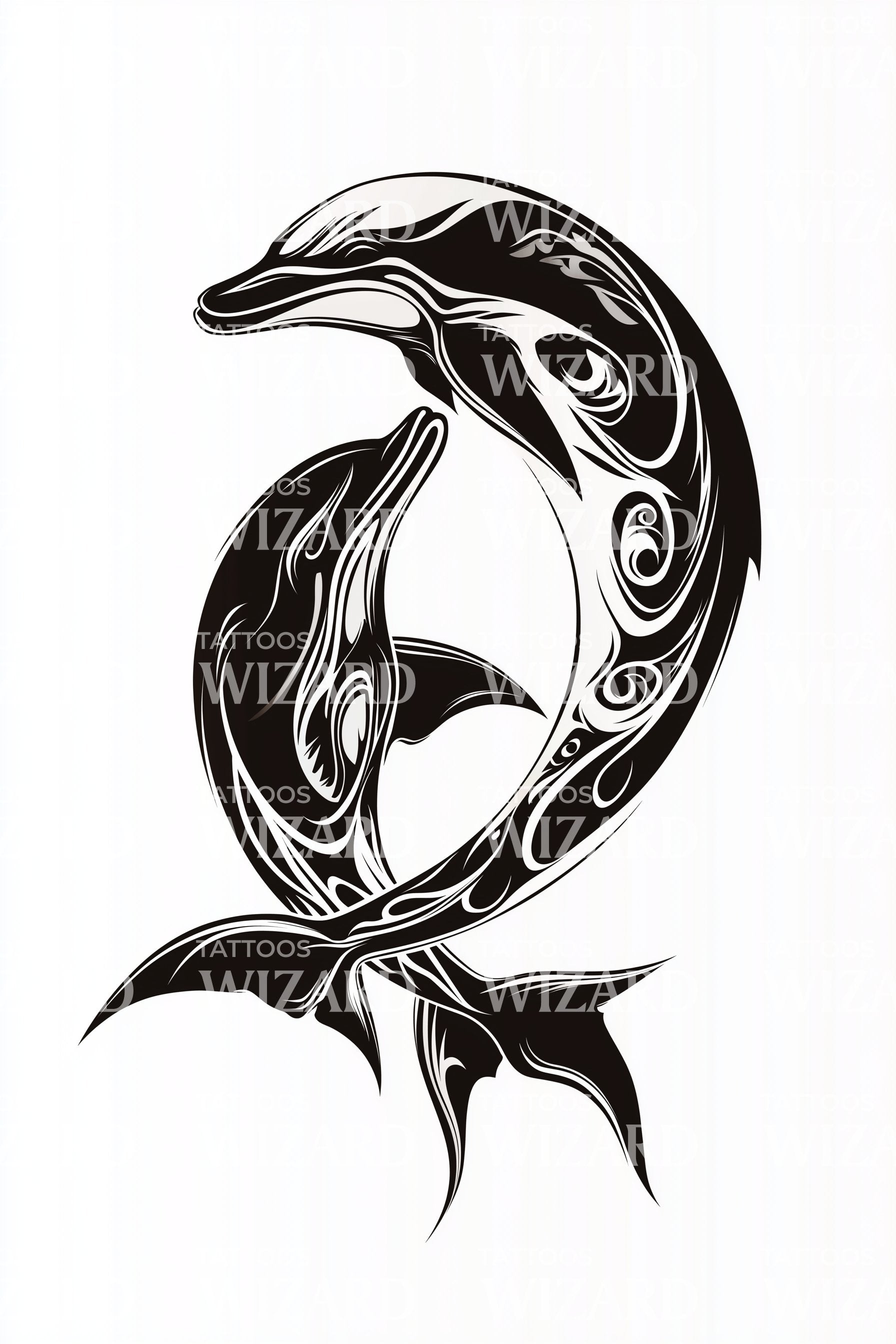 Interlocking dolphins sweep in a tribal curve, carved with Maori-inspired swirls and bold black flow. Their dance honors guidance, playfulness, and safe passage across the ocean. Worn on skin, this design breathes resilience and harmony, inviting tides of joy, intuition, and freedom to carry you forward.