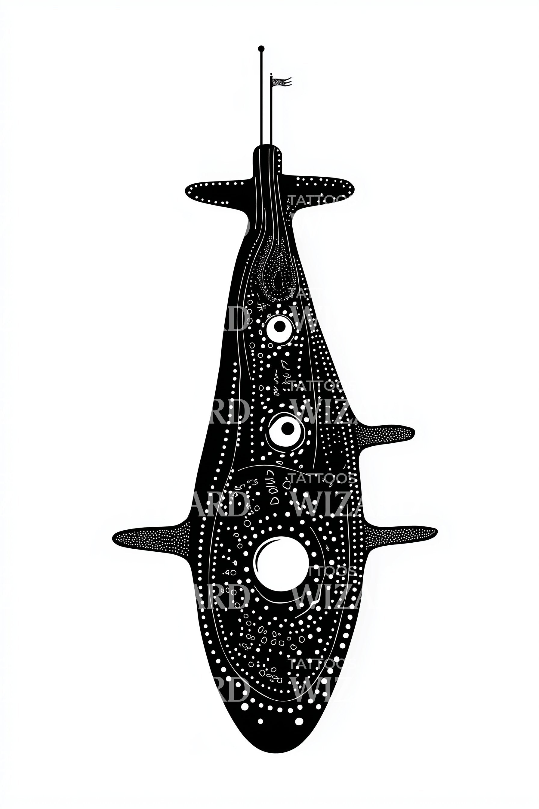 Constellation submarine in dotwork, a sleek silhouette with portholes and periscope, blending navy grit with steampunk wonder. Symbol of inner voyages and calm beneath sea storms, it steadies courage. Feels adventurous yet meditative. Ideal placements: forearm or calf for vertical flow, spine for totemic ascent, ribs for curve.