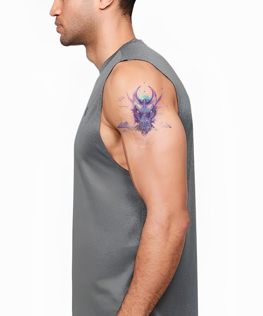 释放你内心的神秘野兽,尽在这款令人惊叹的龙纹身设计中。精心制作,它将几何图案与惊艳的色彩交织在一起,创造出令人印象深刻的墨水艺术展示。这款纹身设计巧妙地捕捉了神话的宏伟魅力和几何艺术的持久魅力。