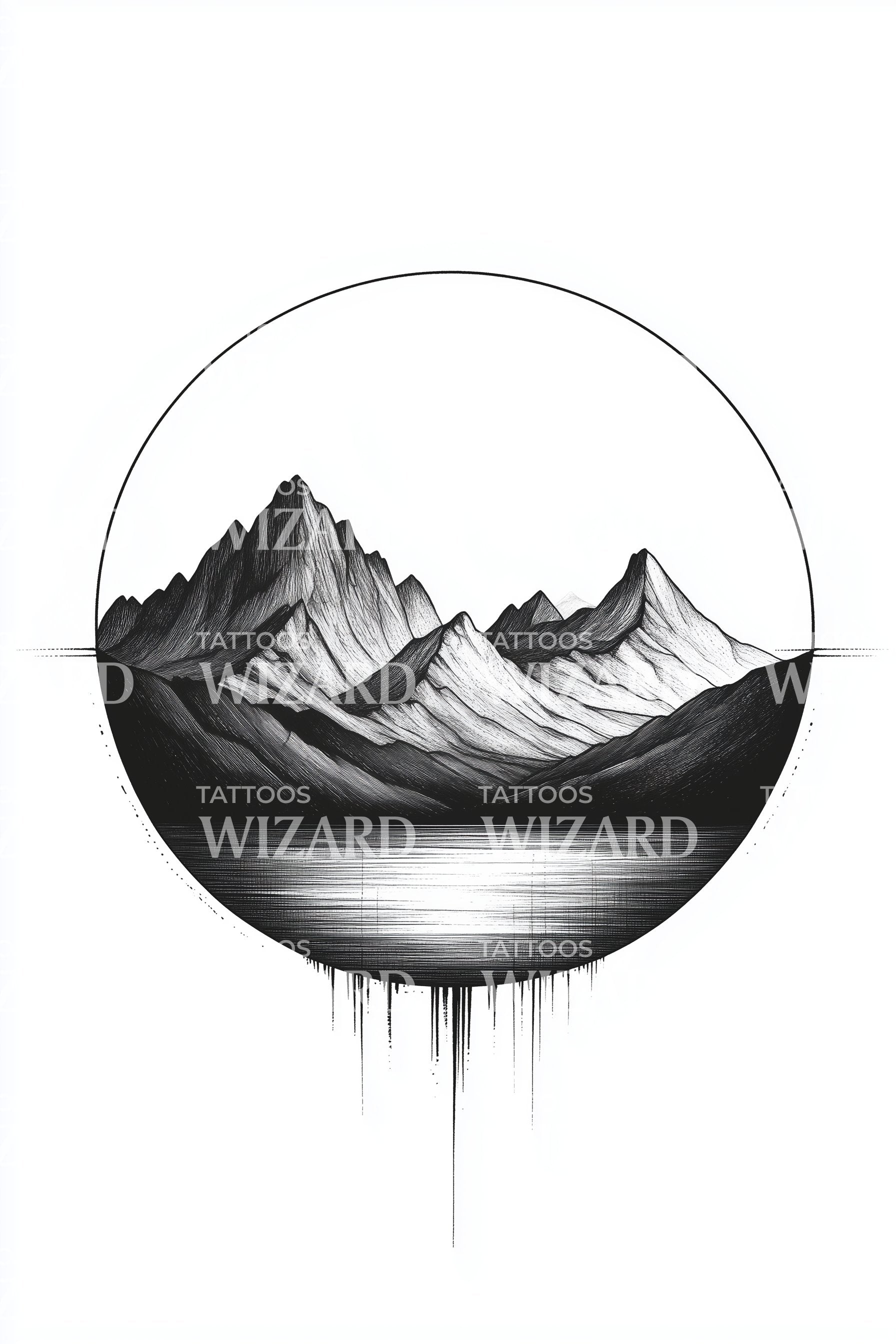 A crisp geometric orb frames jagged mountains mirrored on a still lake, lines tapering into delicate dripping ink. The circle suggests wholeness; peaks embody ascent and persistence; reflection honors quiet introspection. Worn on skin, this abstract landscape inspires grounded bravery, calm focus, and a horizon of becoming.