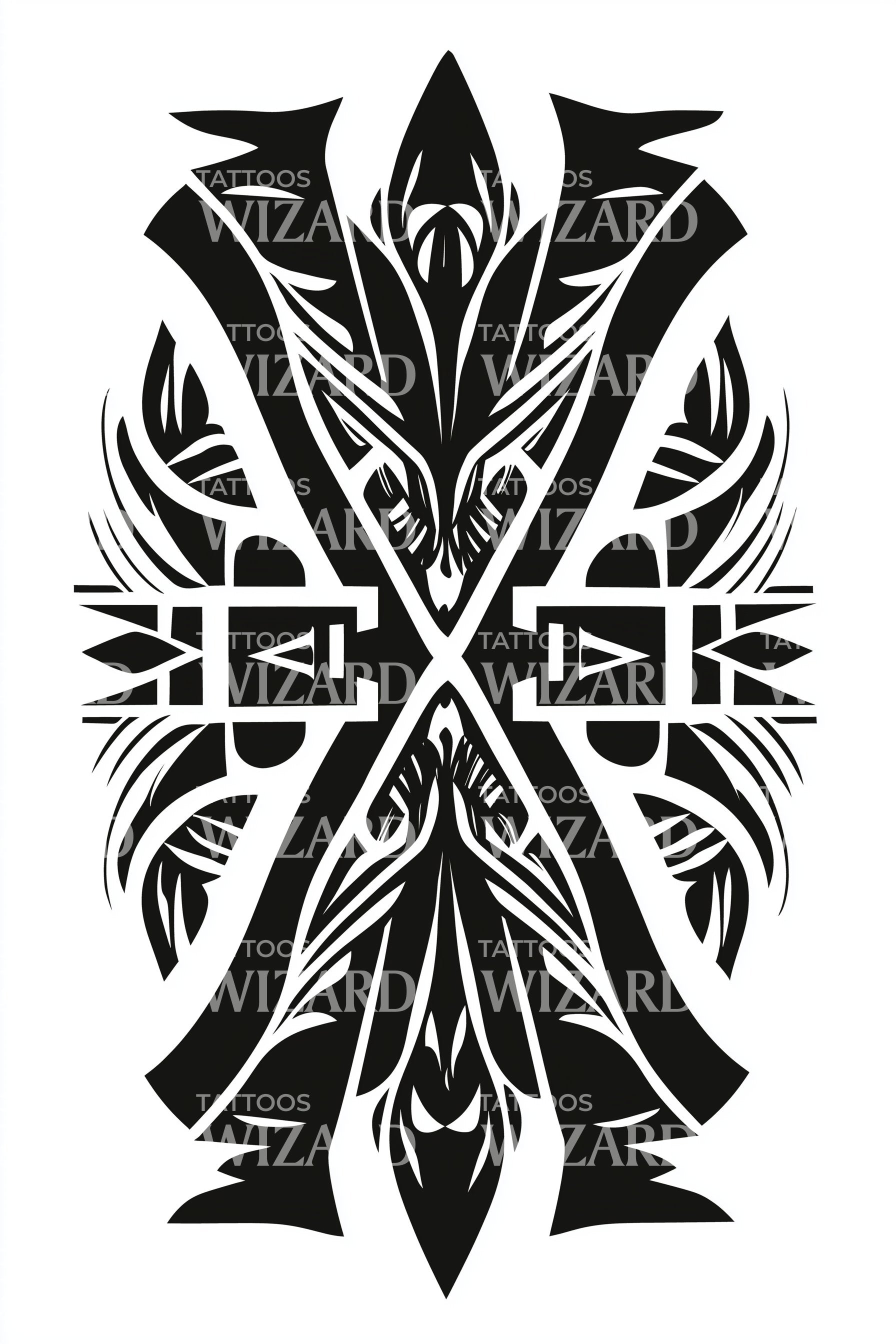 沉浸于古老的故事叙述中,这款部落纹身设计象征着信仰与勇气,展现了精心雕琢的双重十字架与凶猛的部落刀刃交织在一起。以深邃的黑色庄严打造,它是坚韧与信念的热情表达。