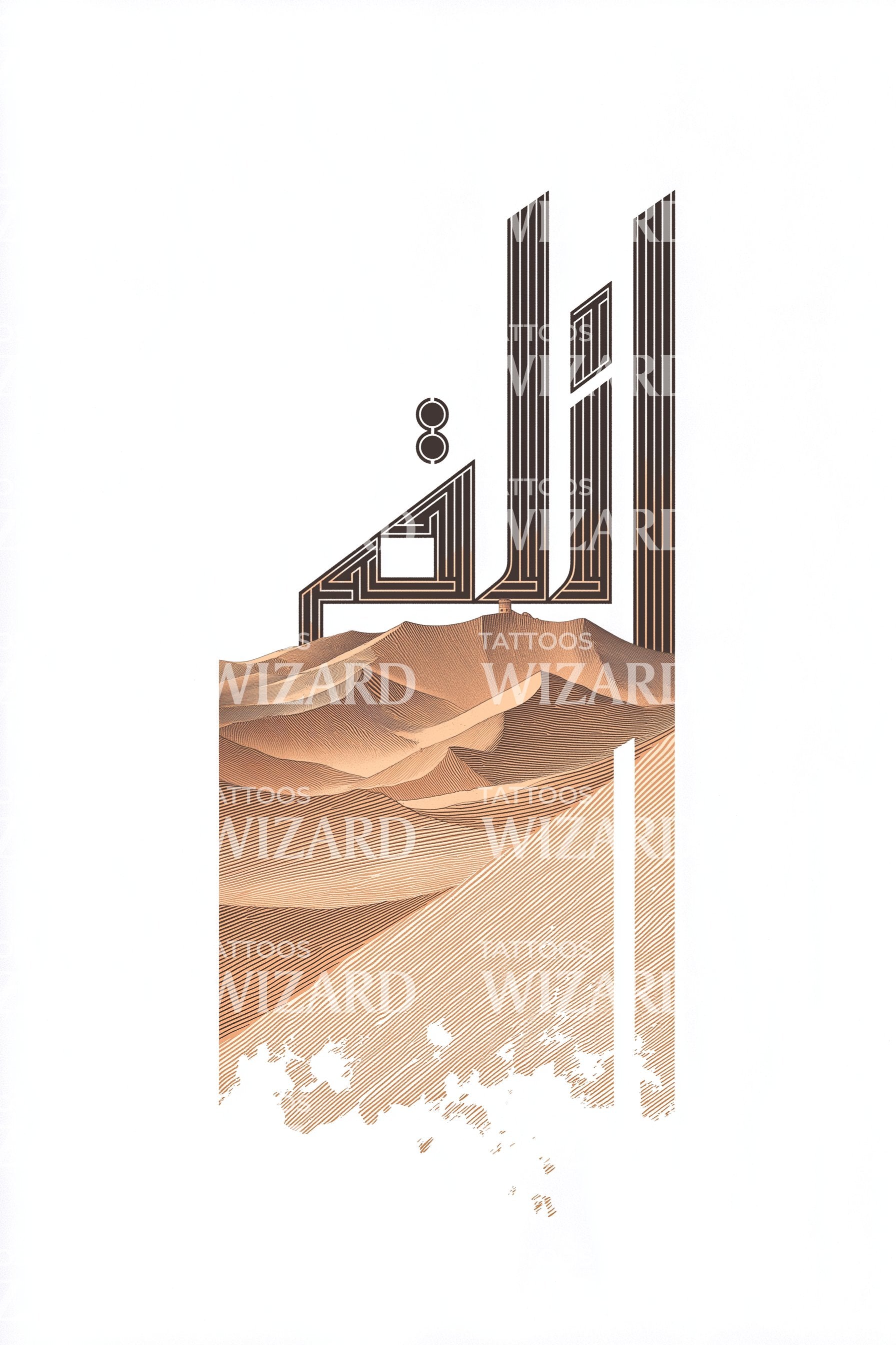 Vertical Arabic calligraphy rises like city spires above fine-lined dunes, sepia and charcoal minimalism. Script speaks of wind-carved resilience and guidance across shifting sands. Wearer feels grounded, quietly nomadic, aligned with horizon. Ideal placement: inner forearm, spine, outer calf, or ribcage; suits tall, flowing geometry and vertical balance.