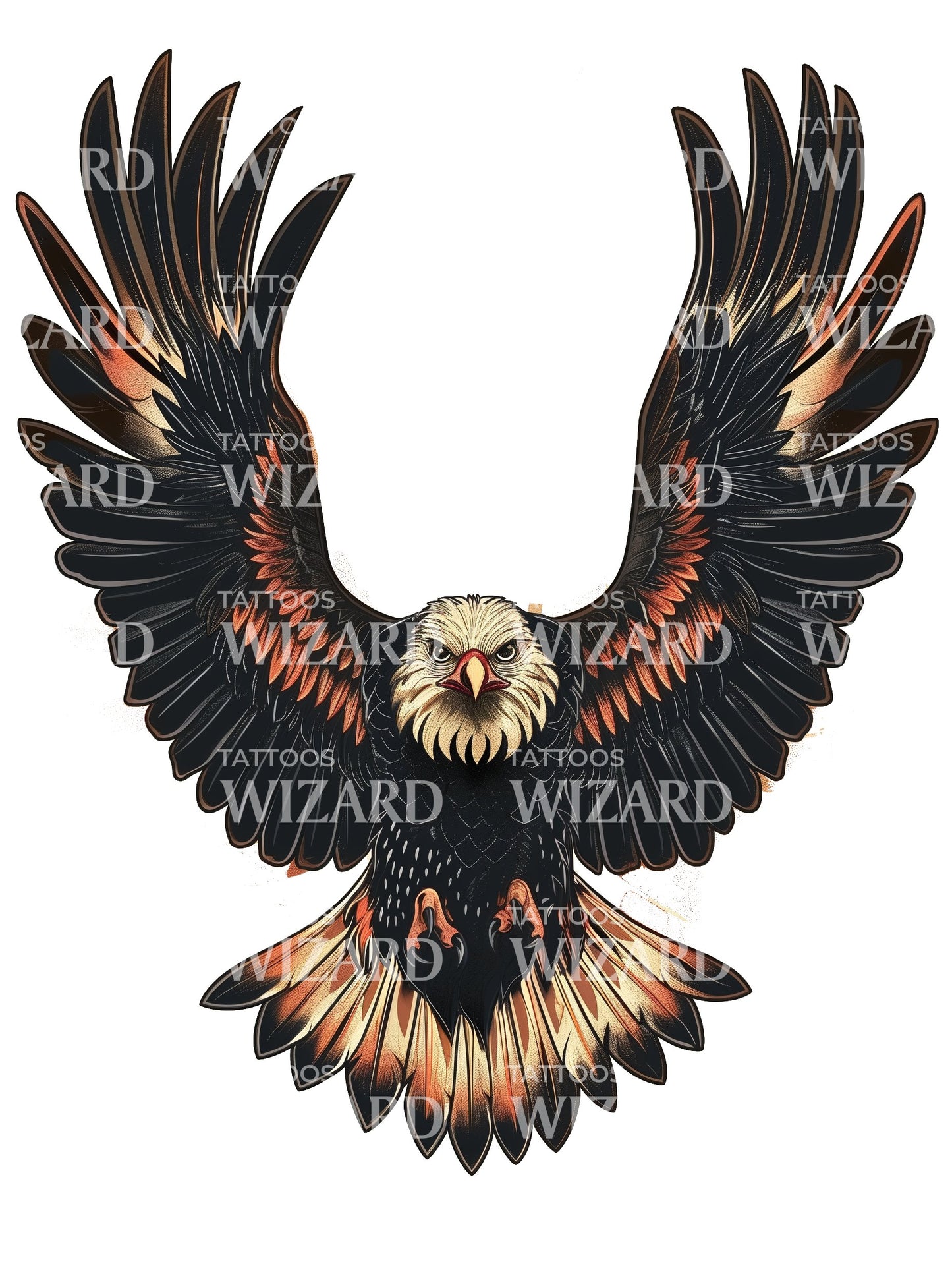 沉浸在这种独特纹身设计带来的老派怀旧中。它融合了雄鹰的宏伟魅力和自由的隐喻共鸣。羽毛、翅膀和象征性匕首的惊人细节进一步增强了这种威严鸟类主题身体艺术的力量。