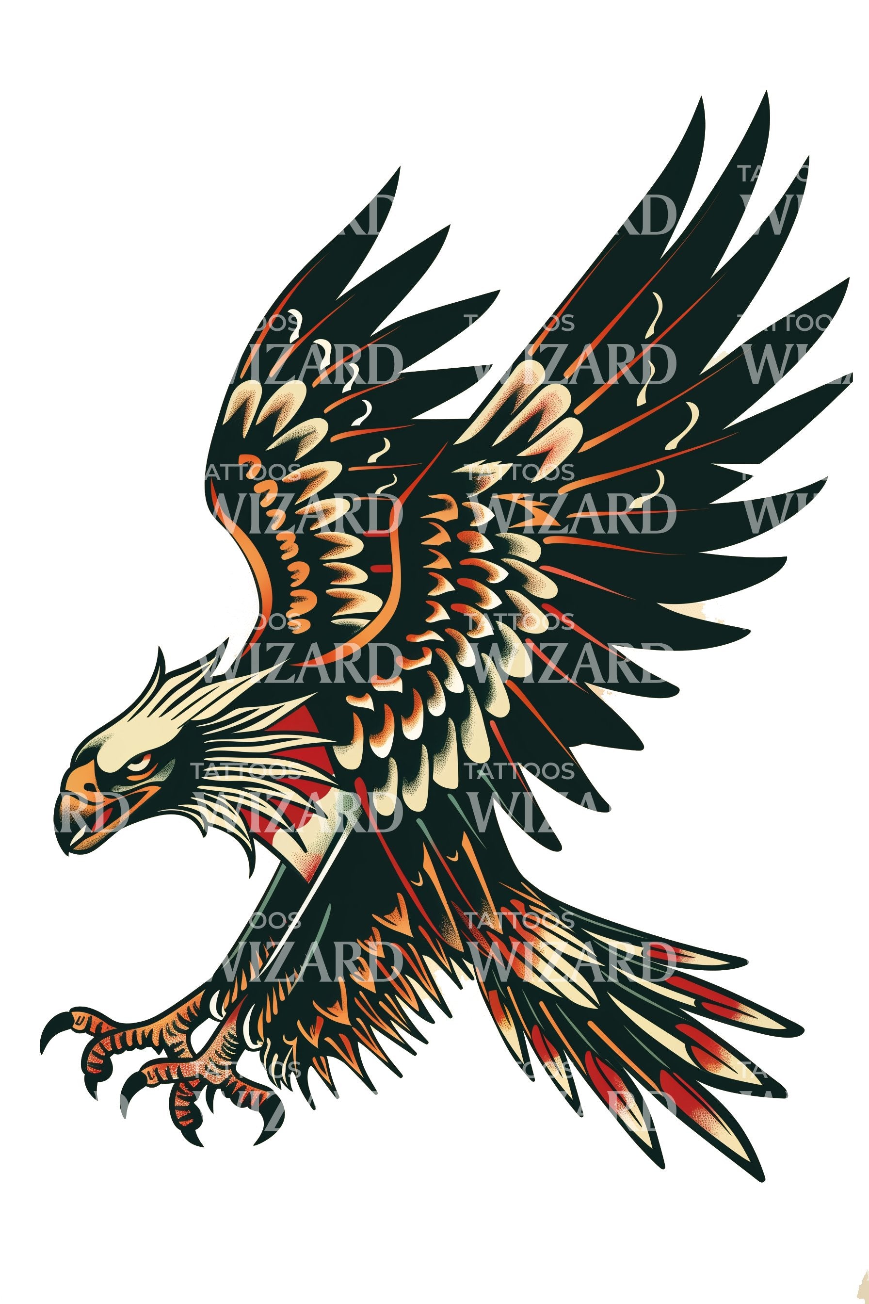 沉浸在这款老派纹身设计中,感受东西方文化的象征性融合。雄伟的鹰象征着自由和力量,与持有象征性剑的沉着武士巧妙交织在一起。细腻的羽毛和宏伟的翅膀为其增添了生动的叙事,展现了鸟类般的韧性和自由。
