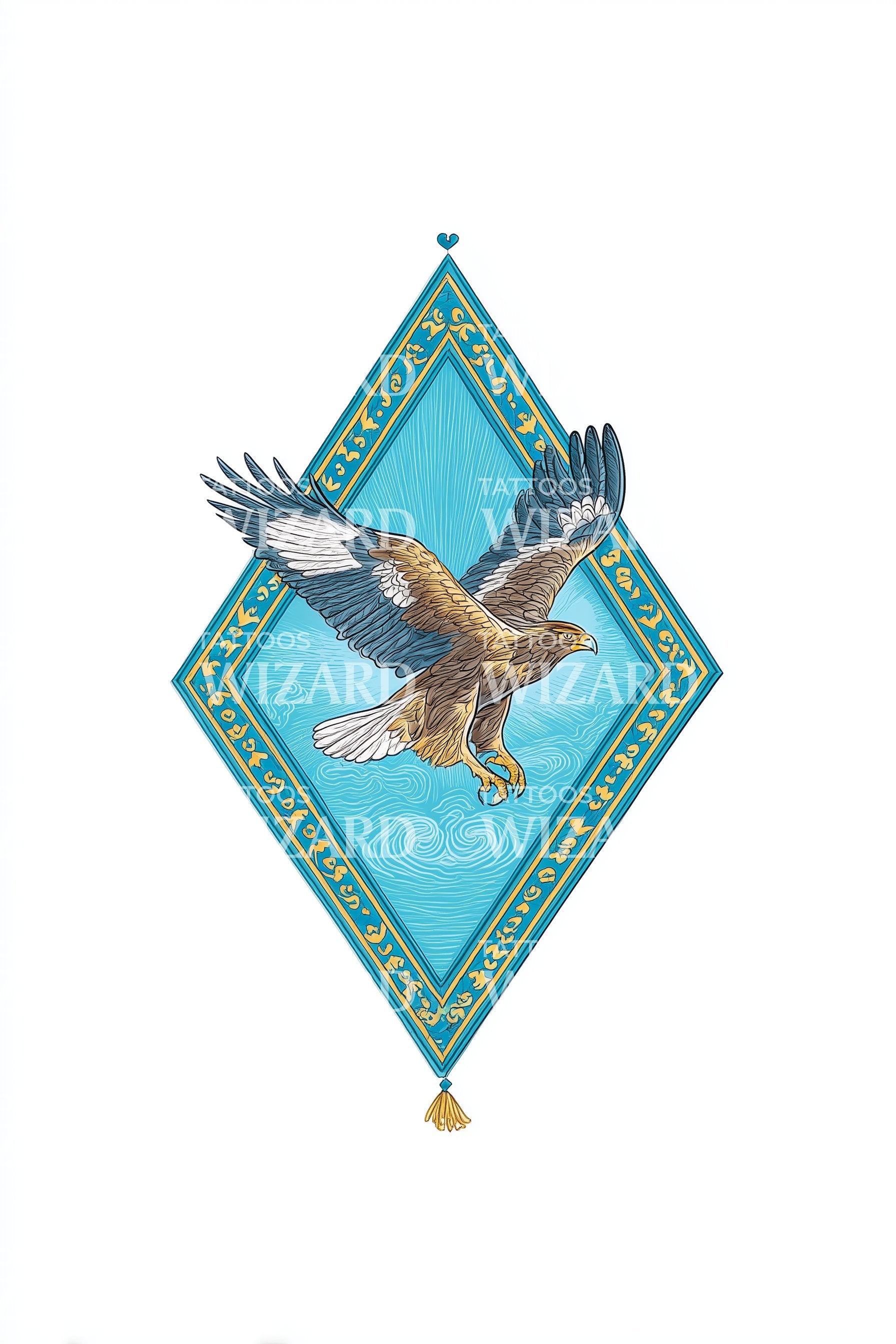 沉浸于丰富的哈萨克斯坦象征主义,这款惊艳的纹身设计展现出非凡魅力。一只象征性的鹰雄伟地穿越钻石框架,每一笔线条都浸润着永恒的青绿色。灵感源自哈萨克斯坦国旗,这幅插画作品大胆彰显了传承、力量与自由的精神。