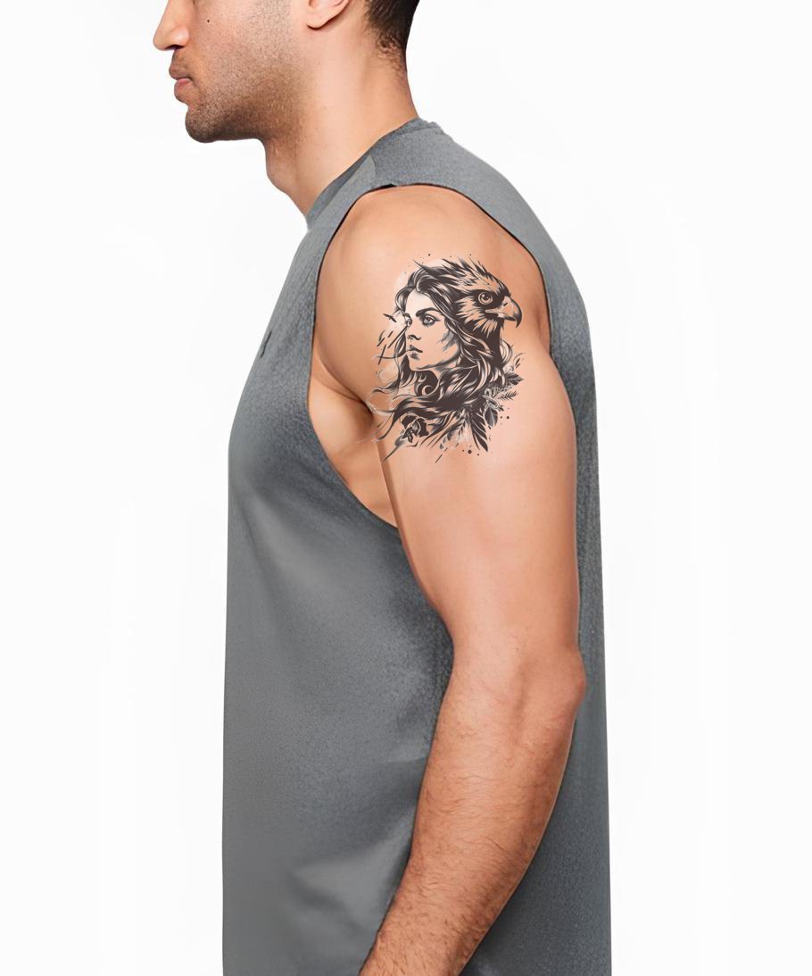 通过这个黑灰色纹身设计释放你内心的力量。精细描绘了一位美洲土著女神的强大鹰的肖像,它美妙地融合了女性之美和羽毛的象征。这一勇气和韧性的象征是你完美的身体艺术选择。