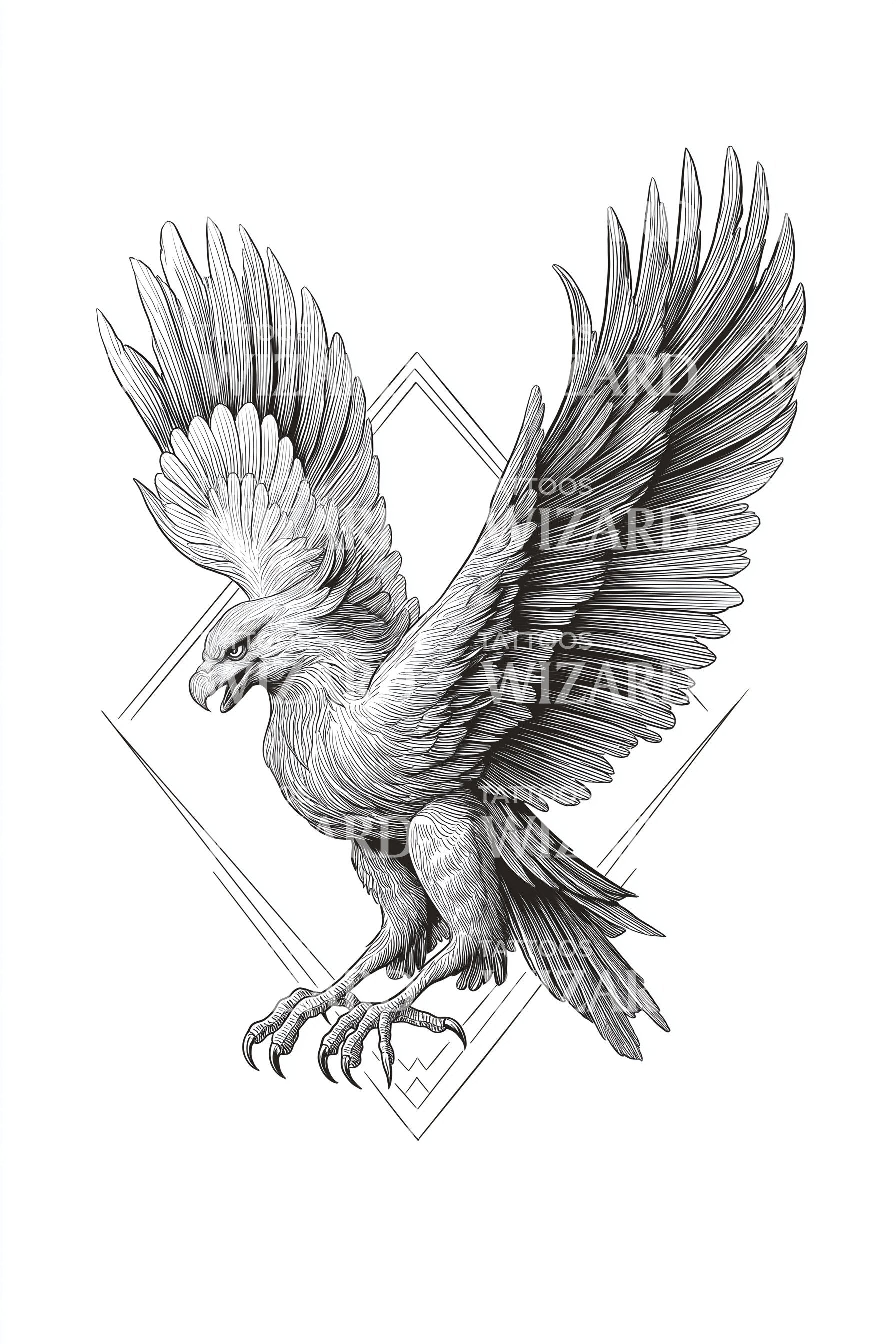黑灰色的鹰以极细的线条描绘,翅膀在极简钻石形中展开,爪子蓄势待发。象征力量、专注以及带着目标降落后再度翱翔的勇气。佩戴如同盾牌,稳固内心。非常适合胸部或背部展翅,前臂或小腿呈现垂直流动感。