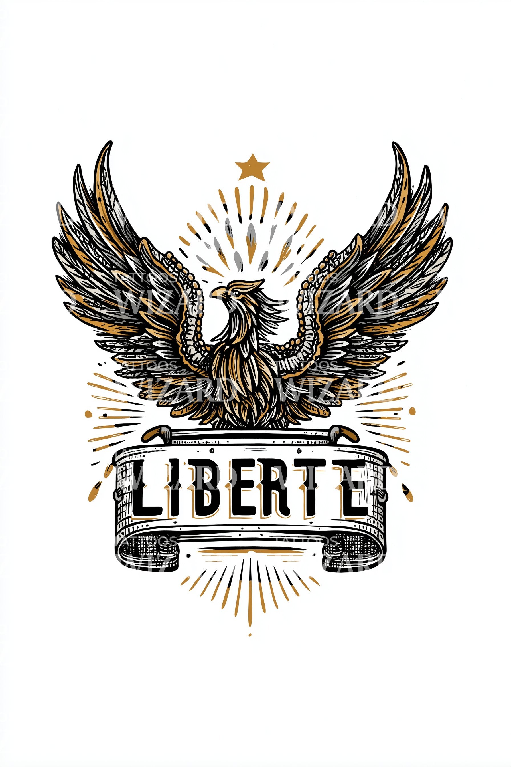 Soaring neotraditional eagle unfurls black-and-gold wings, crowned by a radiant star and framed by a heraldic, shield-like burst. A scroll banner declares LIBERTE. Symbol of guardianship and hard-won autonomy, it honors heritage while promising ascent. Worn on skin, the design steadies courage and invites fearless horizons.