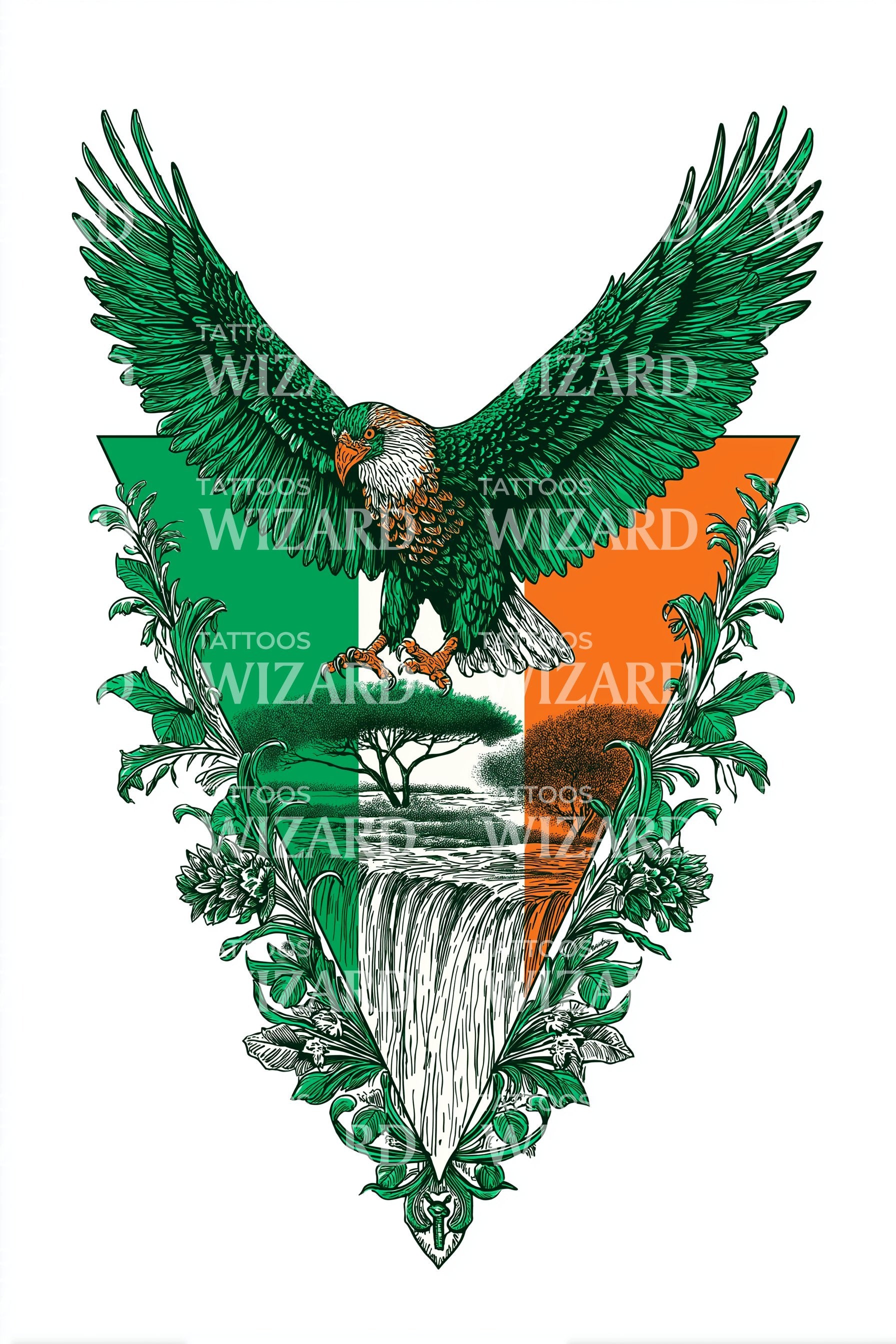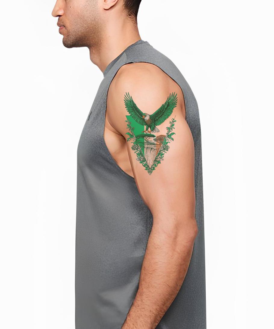 用这款水彩纹身设计庆祝印度自豪感:一只展翅高飞的鹰在一座永恒的纪念碑上展开强有力的翅膀,染上藏红花色、白色和绿色。流动的泼墨、细腻的线条和柔和的渐变营造出动感和深度——是寻求大胆、艺术致敬传统与自由的爱国者的完美选择。