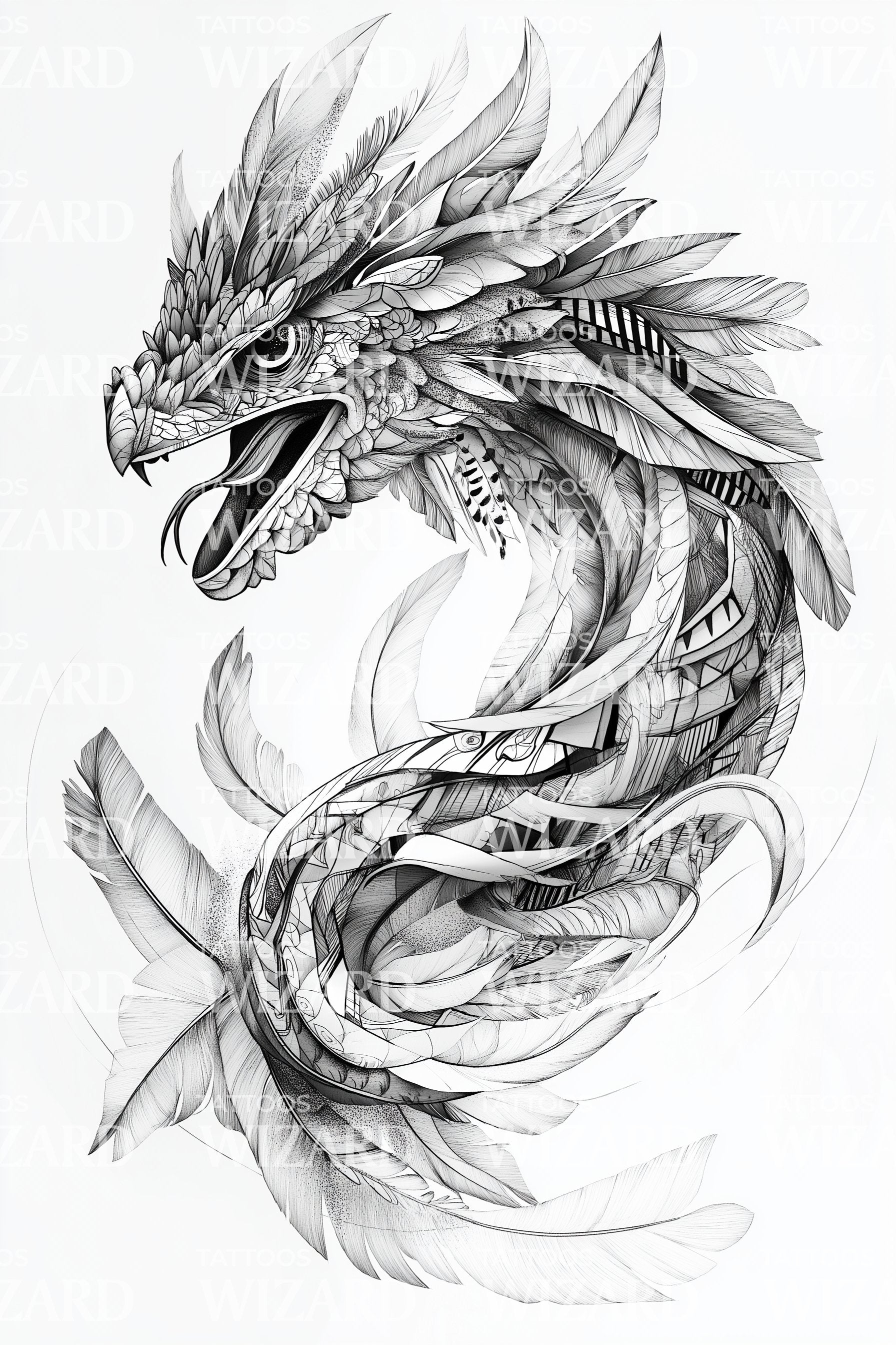 东方龙的墨线素描旋涡,满是羽状鳞片、点状烟雾和环绕的动感。象征着在混沌中升腾,智慧随呼吸而起,神话般的力量保持柔韧流畅。佩戴如同勇气,警觉而宁静。非常适合背部、大腿、肋骨或前臂,每一处都拥抱其宽广的螺旋与流动感。