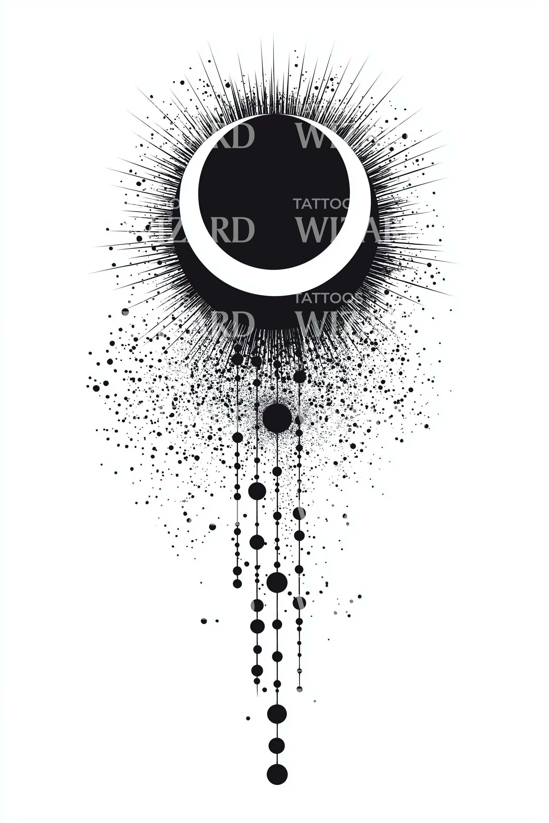 A velvety eclipse crowned in radiant spikes, rendered in pure dotwork, spills nebula-like specks and vertical drip-lines of orbiting spheres. This cosmos suggests cycles, shadow birthing light, and gravity guiding purpose. Wearing it feels centered, lunar-calm, yet starbound, a reminder to move through darkness with magnetic grace.