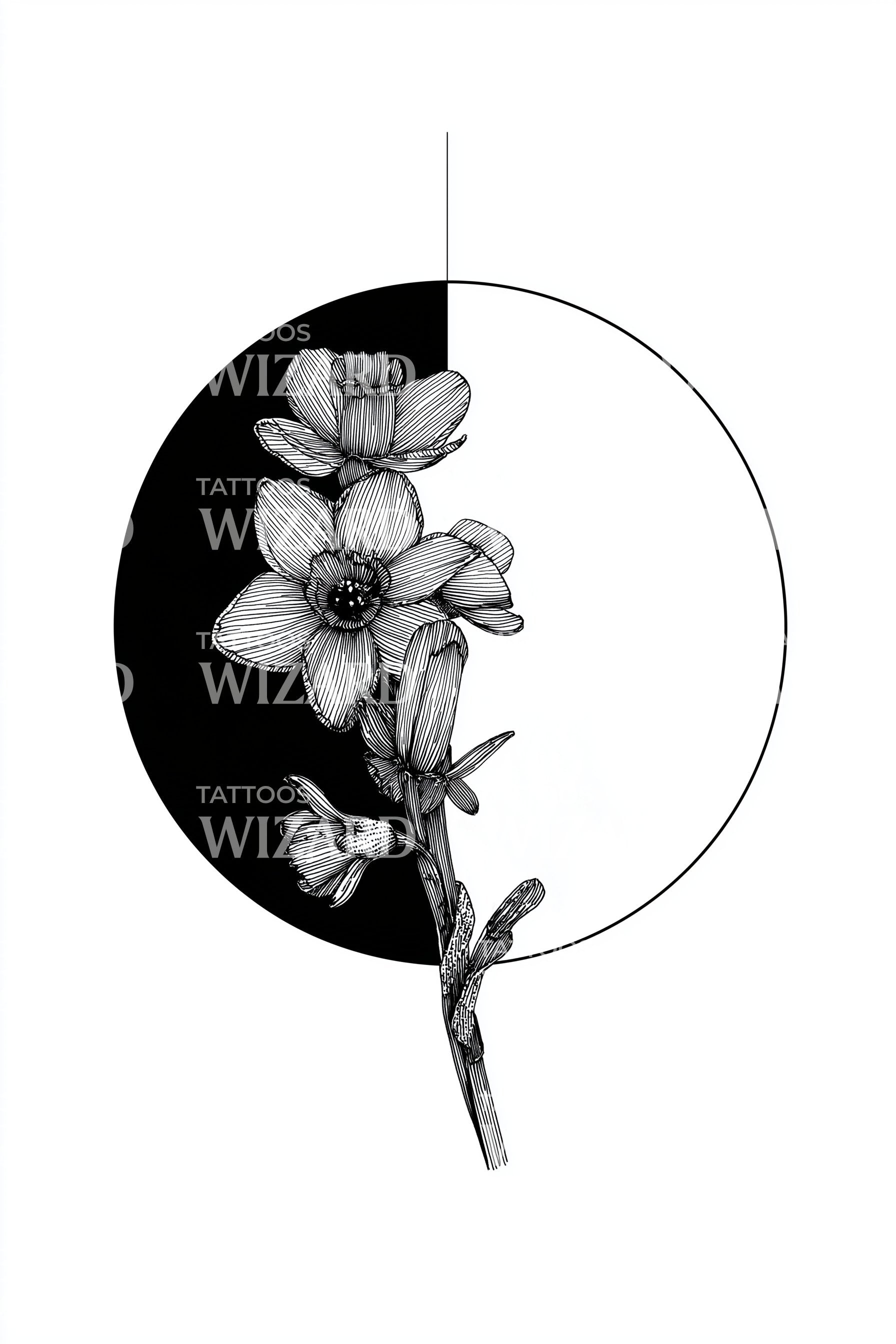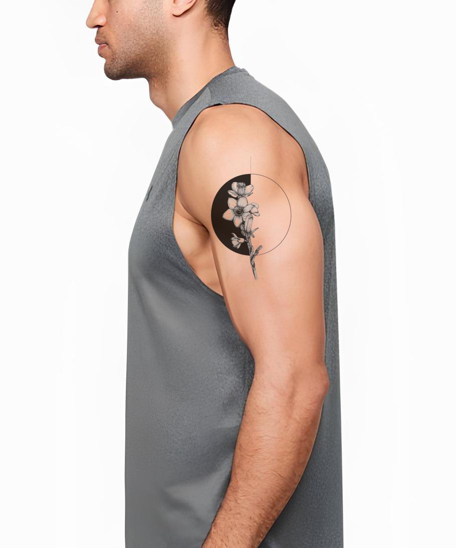 沉浸于这款黑灰纹身设计的迷人魅力。该设计巧妙地将盛开花卉的幸福之美与神秘的日食交织在一起。留白空间与黑灰的深邃形成对比,营造出引人注目的视觉效果,赞美生命中美丽的矛盾。