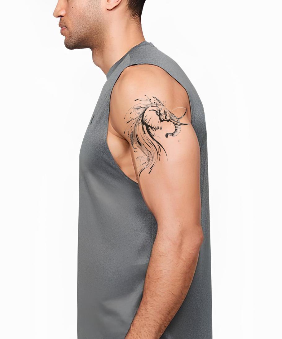 用我们的插图大象纹身设计揭示你内心的野兽。这种雄伟的动物象征着力量和智慧。非常适合精神追求者和冒险者。用这幅引人注目的艺术作品提升你的美学魅力,彰显你令人敬畏的韧性和不屈的力量。
