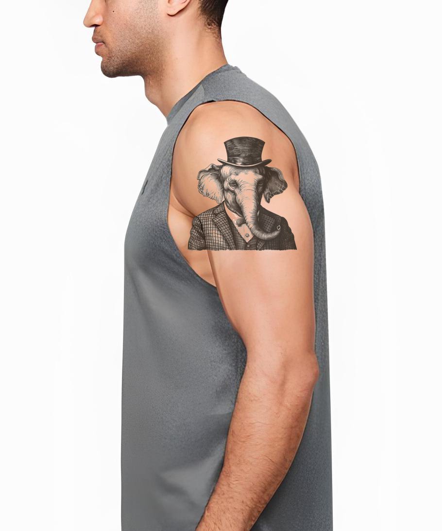 用这个优雅的黑灰色大象纹身设计来装饰你的身体。精心制作的精美草图捕捉了这位温柔巨人的威严。这不仅仅是一项纹身工作,它是与力量、智慧和皇家尊严共鸣的艺术表现。