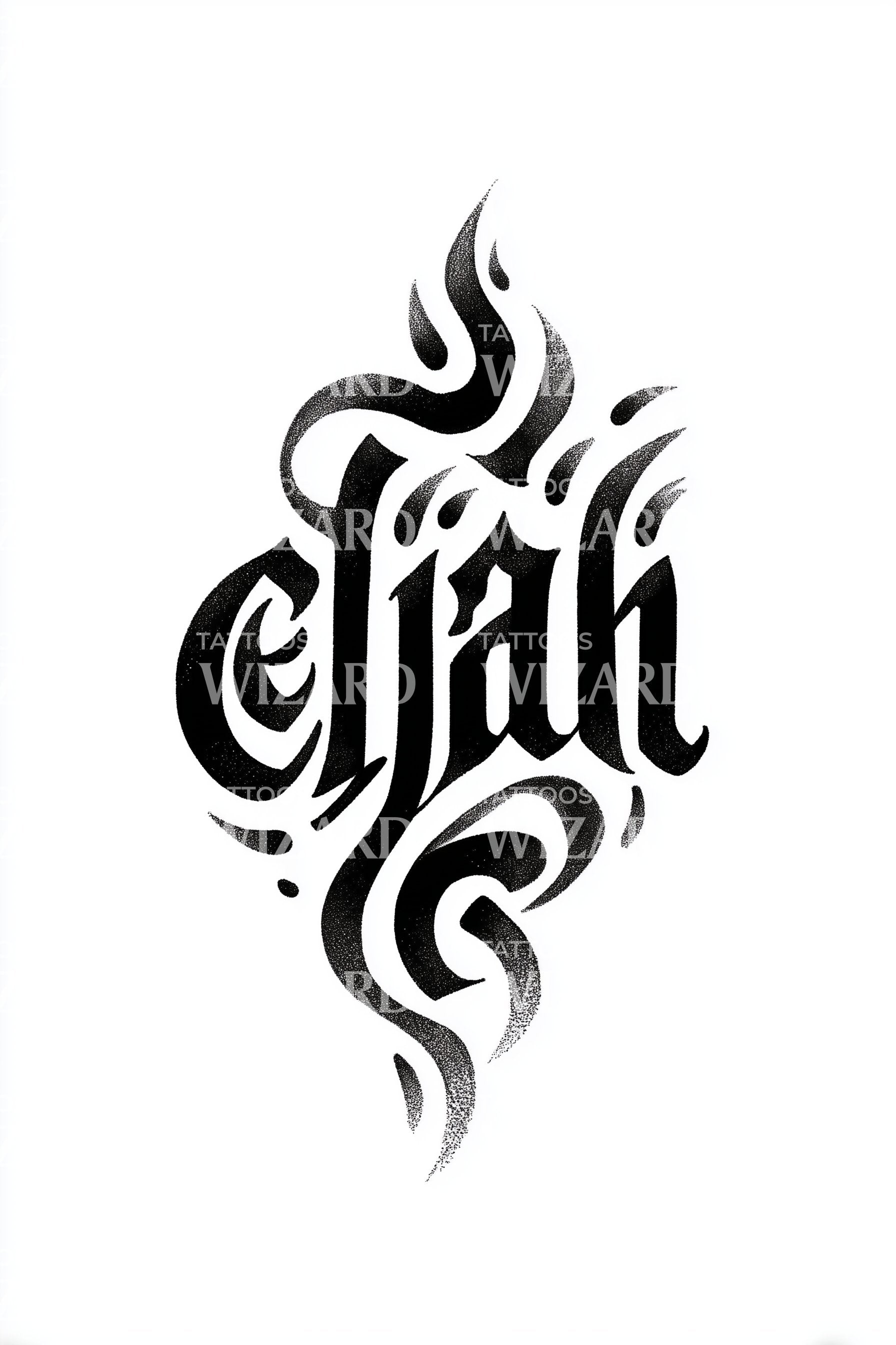 Elijah rises in bold blackletter, wrapped in sweeping tribal flames and soft stipple shadows. Each curve forms a protective name-symbol, honoring strength, devotion, and renewal. Fire-like strokes suggest spirit lit from within. Wearing this design feels grounded, fearless, and personal, a calligraphed vow carried close every single day.