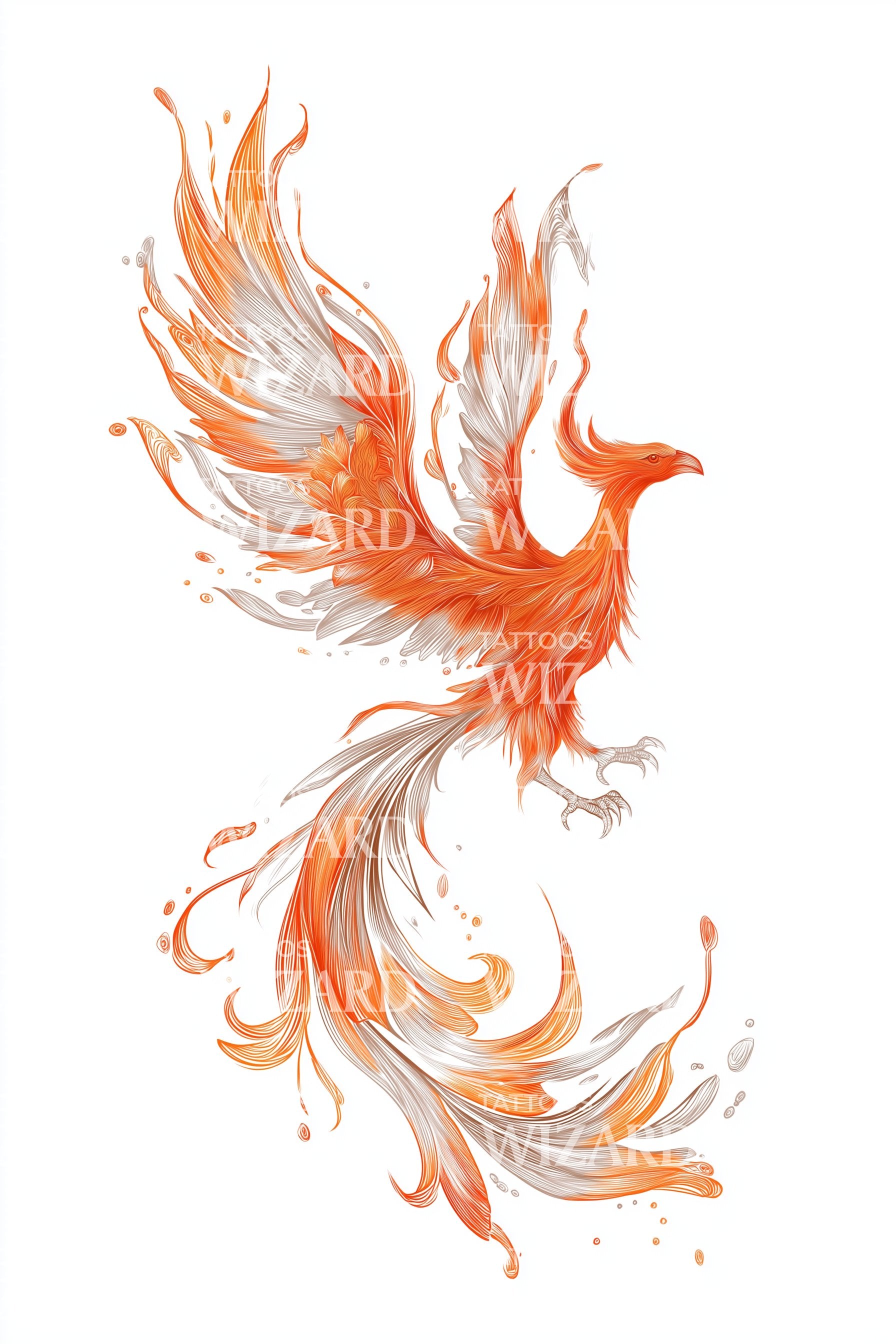 沉浸于这款水彩凤凰纹身设计的精美之中。采用鲜艳的橙色调,描绘出凤凰浴火重生的景象,象征着不屈的精神。这件作品完美体现了坚韧、重生与蜕变,以艺术水彩风格呈现。