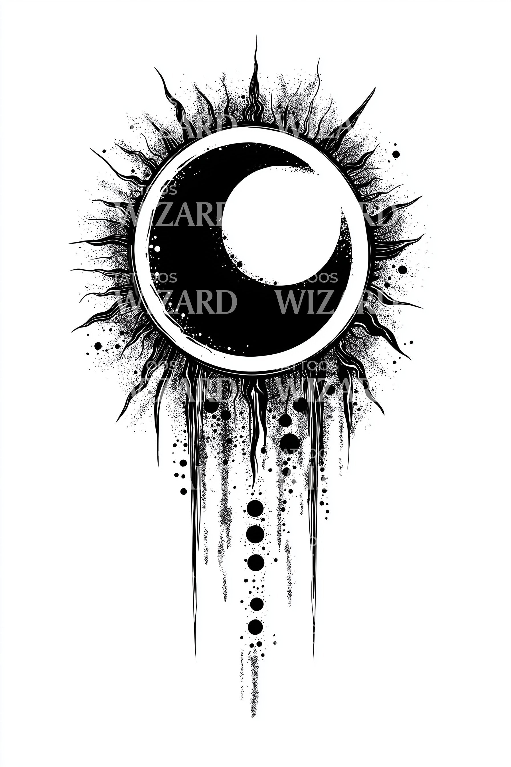 Blackwork eclipse crowned by sunbursts, a bold crescent nested in a dark halo. Ink splatters and falling orbs trail like stardust, channeling raw energy. Symbolizes alignment, renewal, and thresholds crossed. Worn close, it feels like a quiet supernova, cosmic protection meeting forward motion, shadow birthing luminous momentum within.