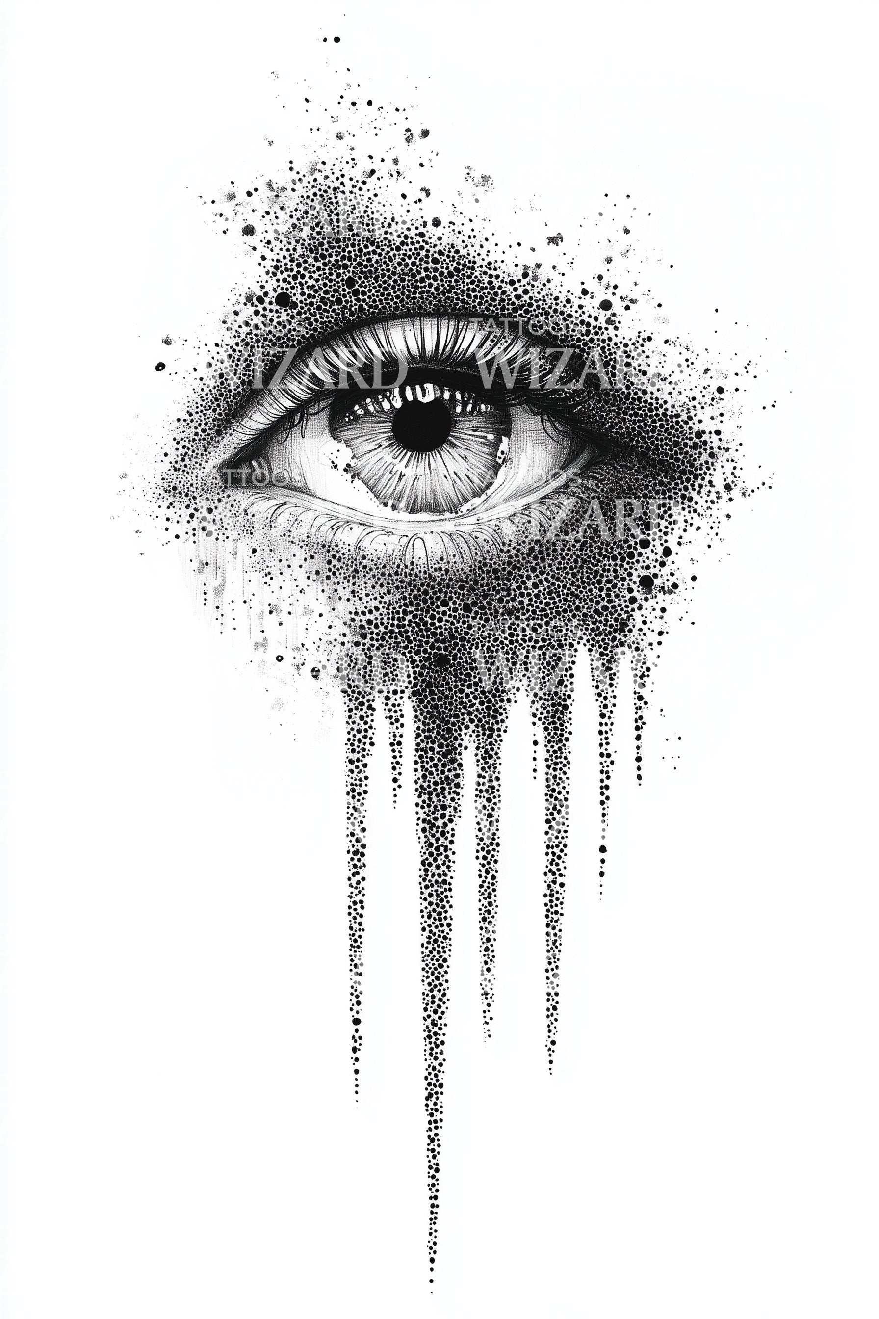 沉浸于我们点描纹身设计的神秘象征中。设计展示了一只流泪的迷人之眼,传达出悲伤的情感,捕捉了人类情感的本质。黑色墨水的滴落增添了独特的沉重感,使其成为艺术表达的精美体现。