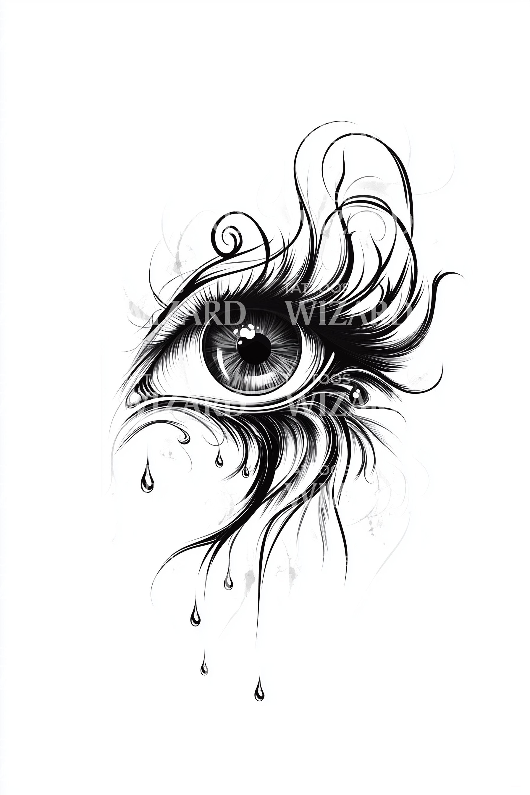 Fineline eye unfurls into feathered lashes and suspended tears, rendered in minimal, delicate strokes. Symbol of perception and release, it honors beauty in vulnerability and clarity after sorrow. Worn, the spirit feels watched over and brave. Ideal placements: forearm, ribs, calf, or collarbone for vertical flow and balance.