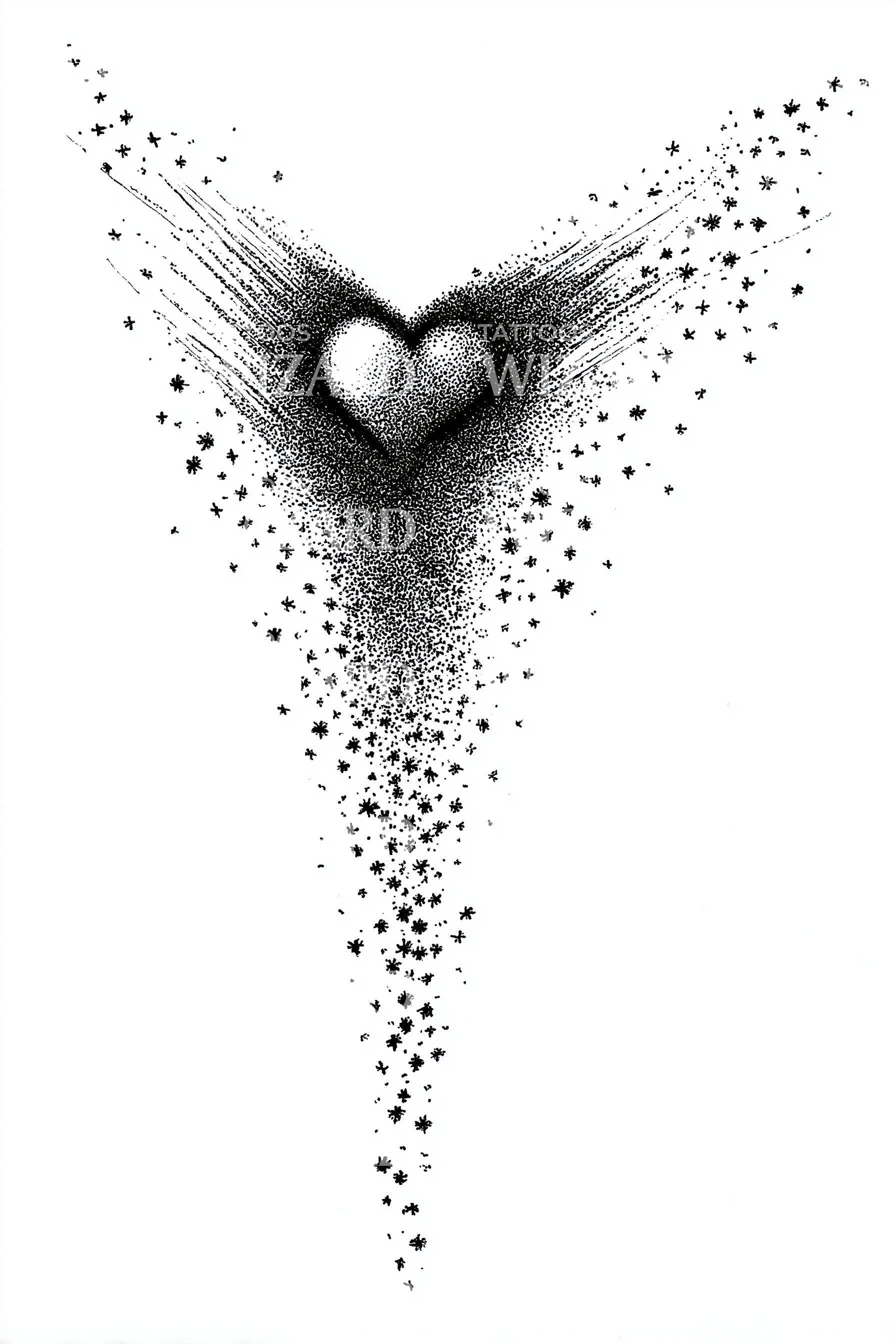 这个抽象纹身设计融合了独特的心形星座图案,仿佛在坠落,以惊艳的点描技法呈现。由大小不一的点组成,生动展现了艺术家对情感深度的独特视角,成为爱与脆弱的迷人象征。