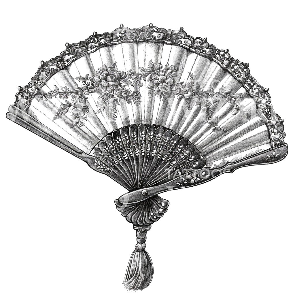 沉浸在经典艺术的美丽中,欣赏这款时尚的复古风扇纹身设计。采用永恒的黑灰素描,散发出华丽的魅力。其复杂的墨水工艺模仿复古的宏伟,使其成为纹身艺术的优雅定制体现。