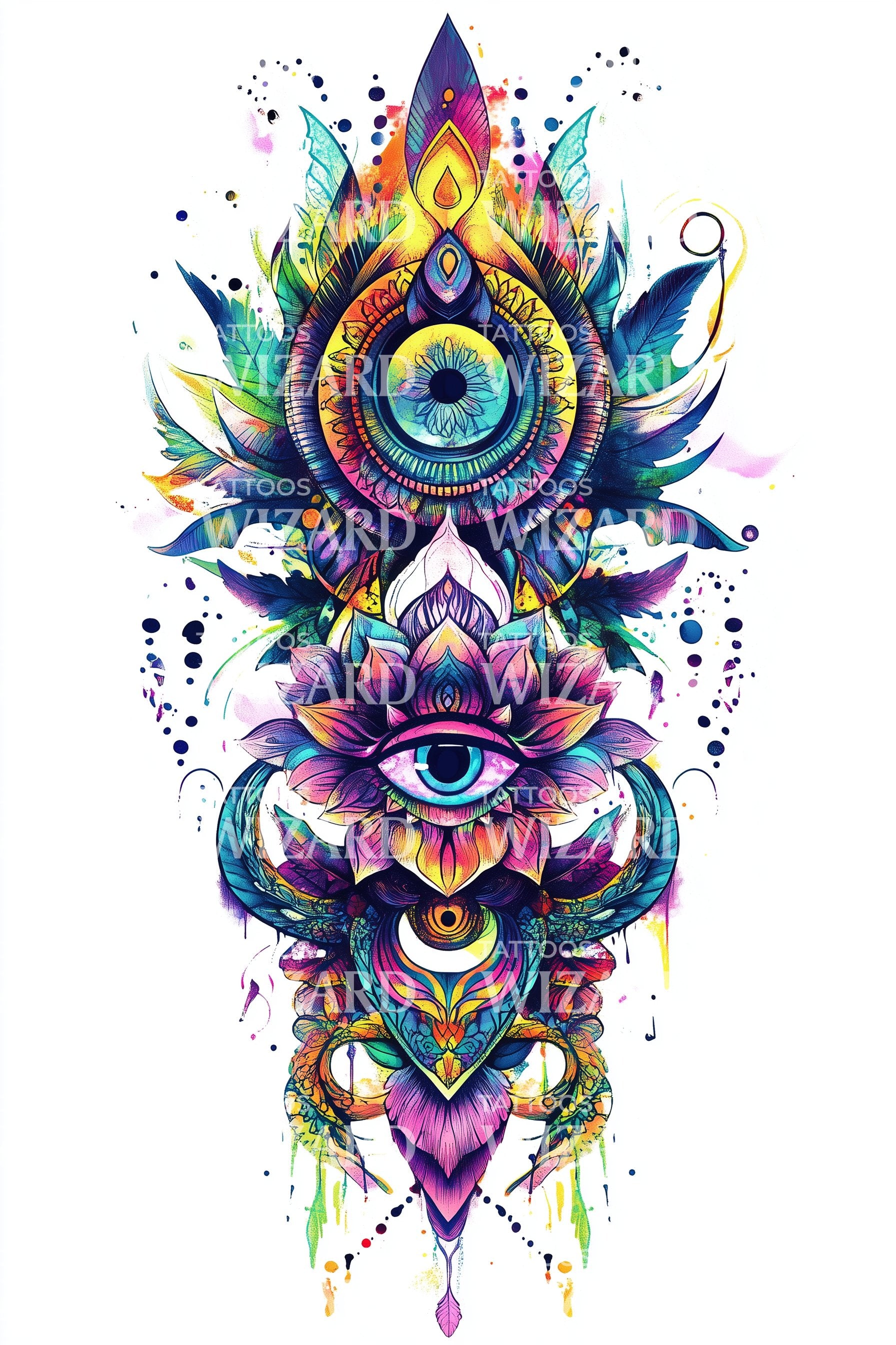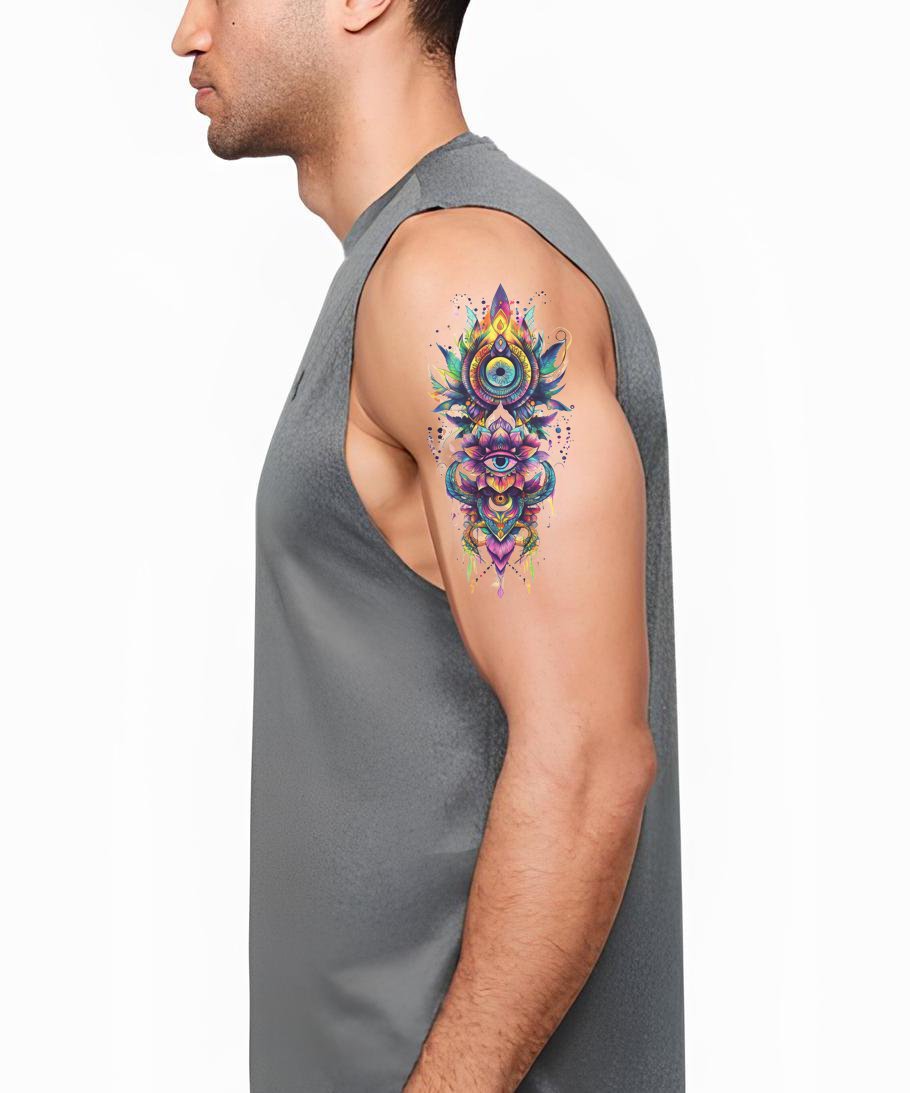 用这款装饰性的孔雀图腾纹身设计提升你的身体艺术水平。浸润在鲜艳的色彩中,这款引人注目的垂直设计将传统图腾美学与奇幻的孔雀羽毛相结合,呈现出前卫而优雅的风格。对于热爱个性纹身的人来说,这是必备之选!