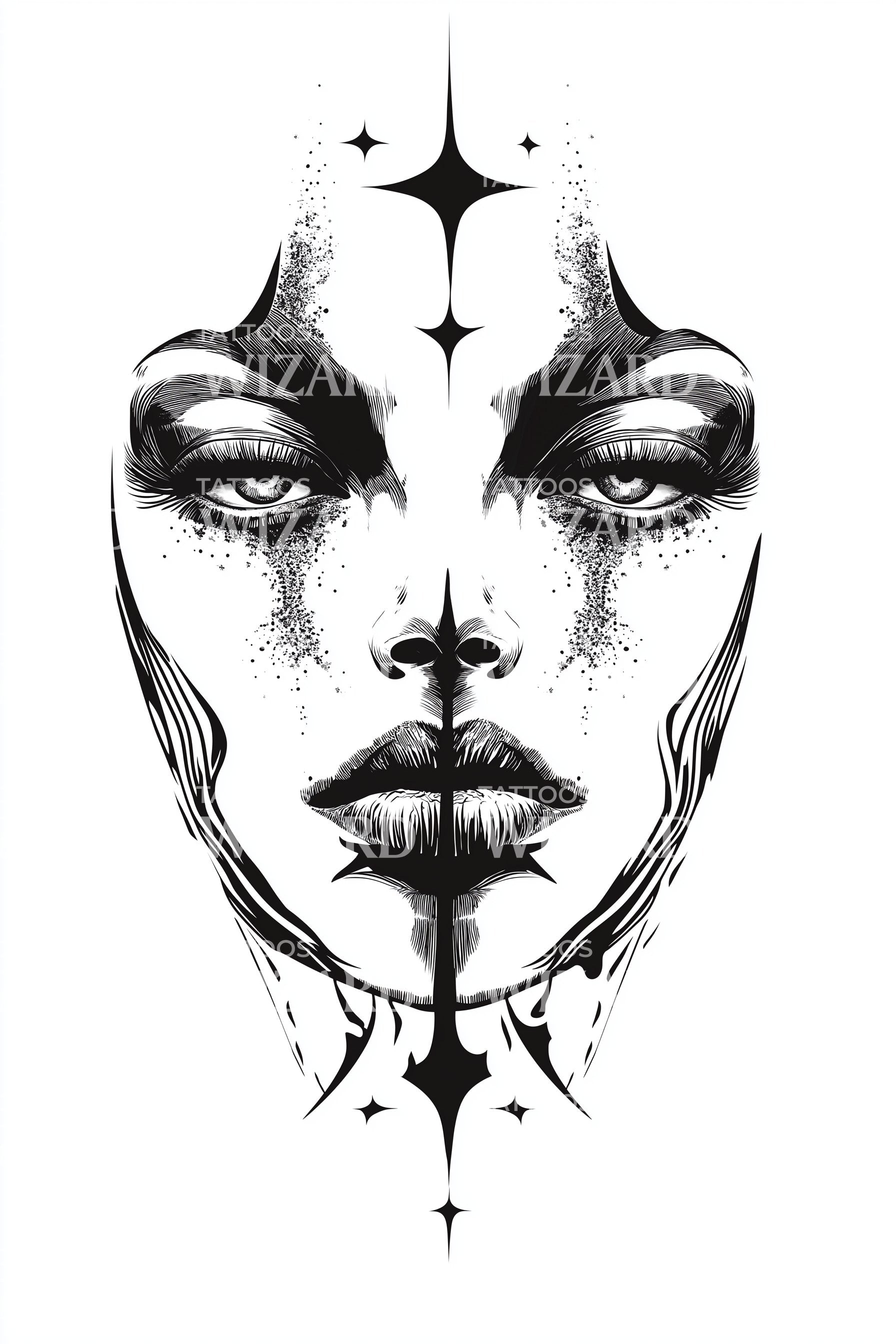 以这款精美的装饰性纹身设计,展现你神圣的女性能量。对称的艺术图案描绘了一张迷人的面孔,细致入微,环绕着精致的星星。采用柔和的黑灰渐变渲染,唤起深邃而空灵的美感,必将令你着迷并激发灵感。